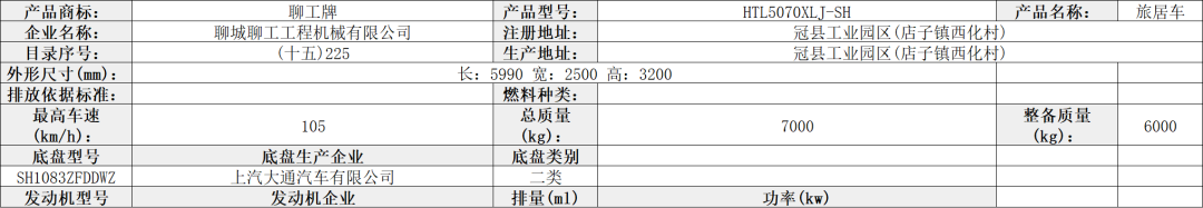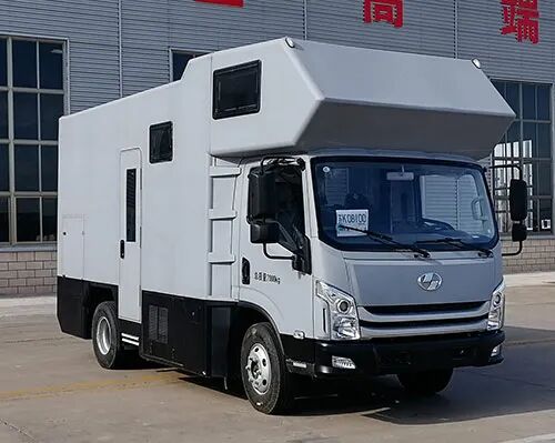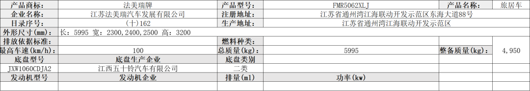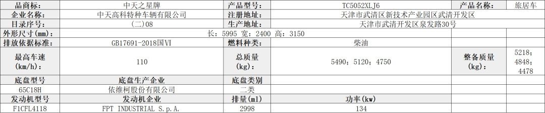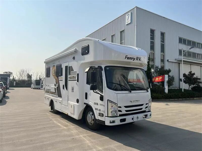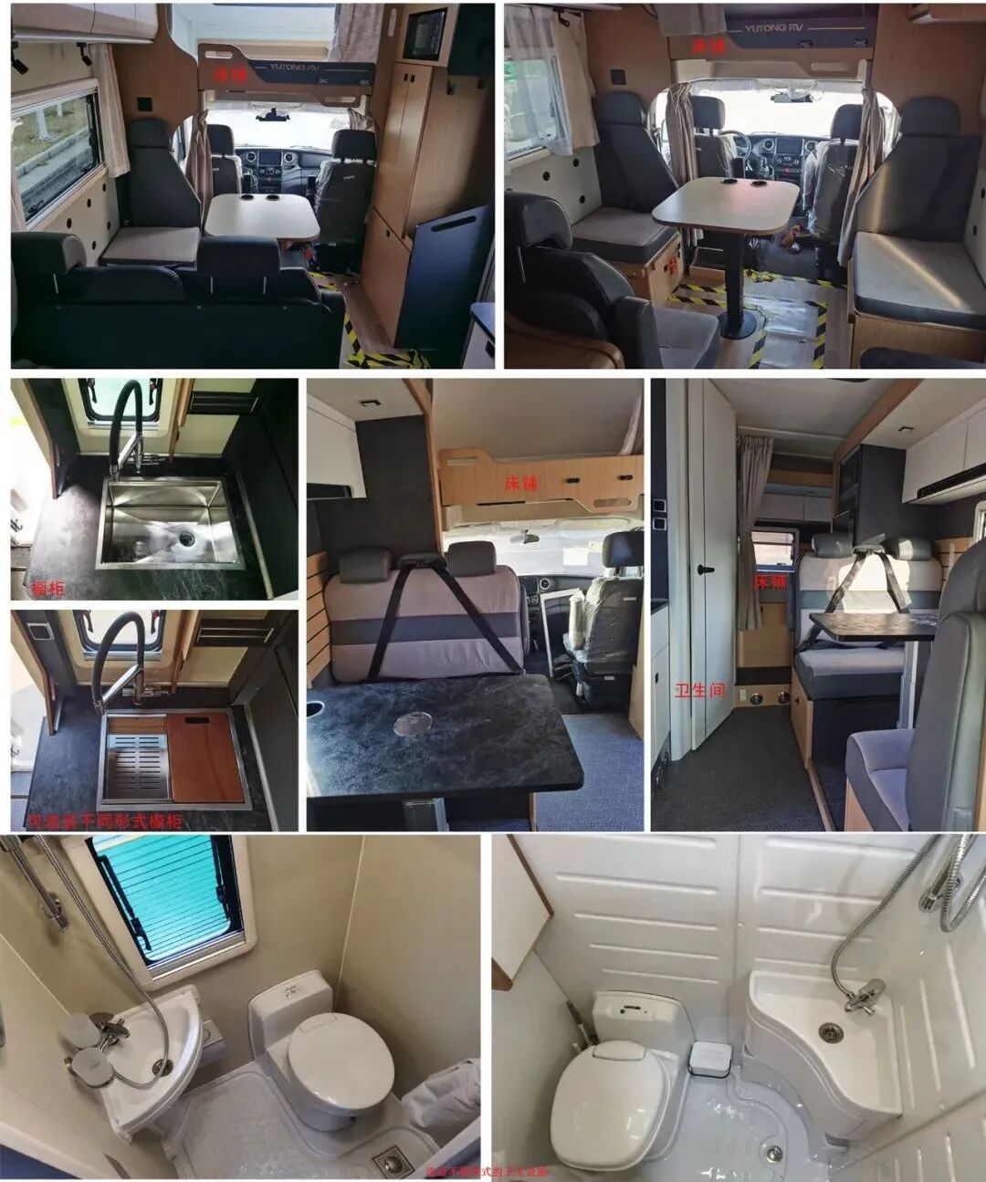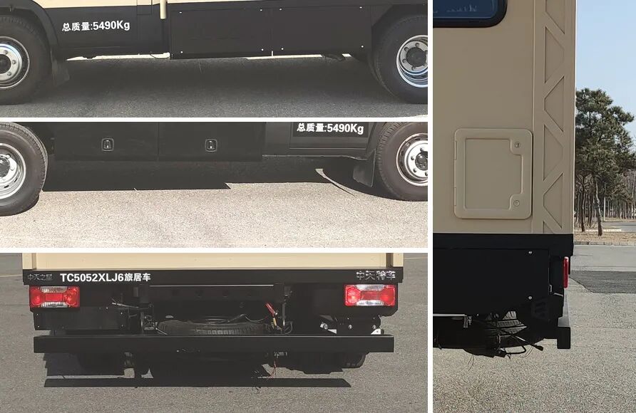 该车主要用于外出旅游居住,方便出行;本车型装备桌椅、睡具、卫生设施等设施,车辆顶部可选装车顶行李架、顶置空调、太阳能电池板;侧防护为裙边结构,材质为Q235;后防护材质为Q235,后部防护断面尺寸(mm):100×80,后部防护离地高度(mm):440,连接方式为焊接;该车型可选装ETC车载装置。