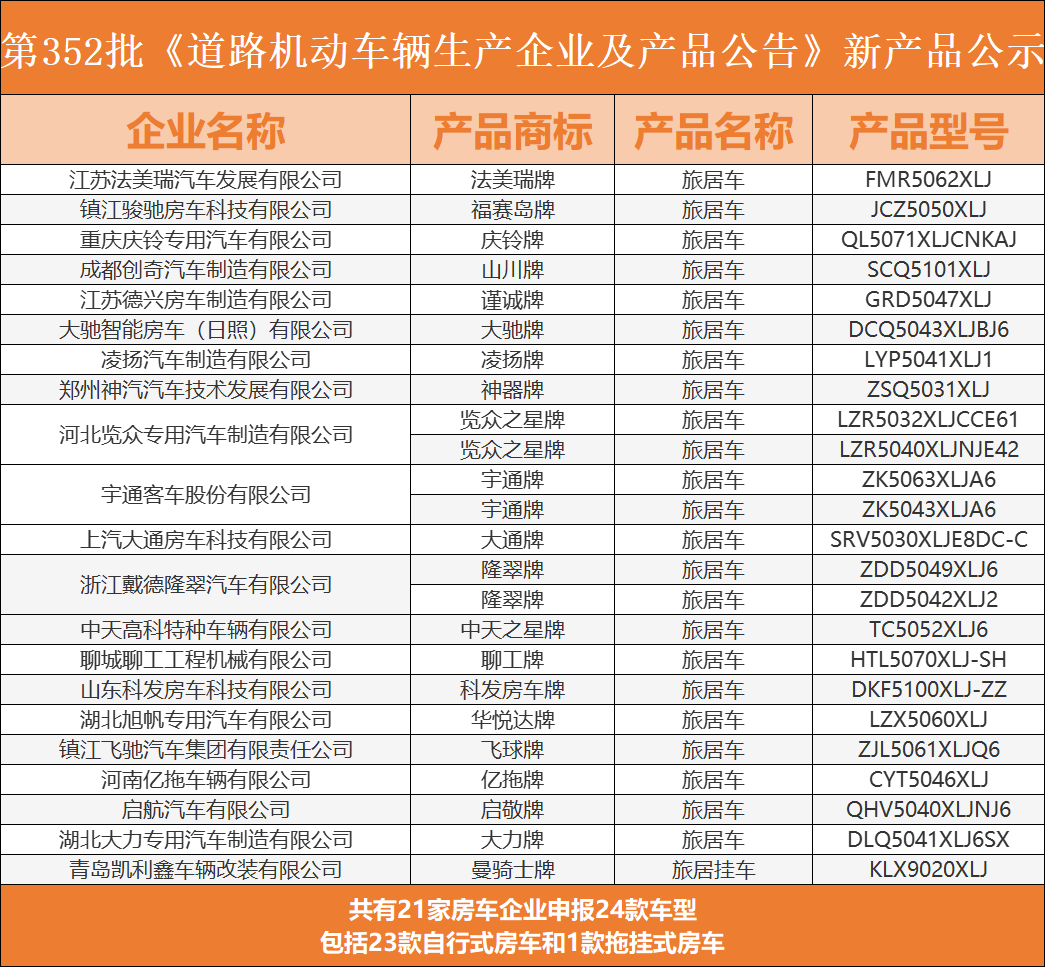 而352批《道路机动车辆生产企业及产品公告》(以下简称《公告》)新产品公示作为2022年第一批旅居车公告,共有21家房车企业申报24款车型,包括23款自行式房车和1款拖挂式房车。此次申报车型中,特色车型占比提高,新增不少轻卡、重卡房车,之前爆料中提到的览众越野升顶房车首次在公告中出现,预计2022年一季度上线的大通T90皮卡房车也在公告中亮相,估计很快就能和大家见面。