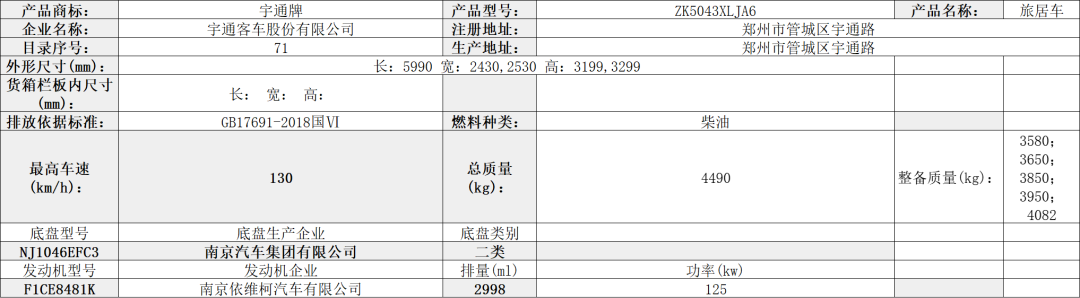 1.该车配备卧具、厨具、卫生设施等旅居生活设施,用于旅行宿营;2.ABS系统控制器型号:BOSCH ESP9;3.选装高配时对应整备质量为4082kg,选装中配时对应整备质量为3950kg或3850kg,选装简配时对应整备质量为3650kg或3580kg;选装不同形式空调时整车高度为:3299mm或3199mm;车身两侧均选装遮阳棚时对应整车宽度为2530mm,单侧选装遮阳棚时对应整车宽度为2430mm。