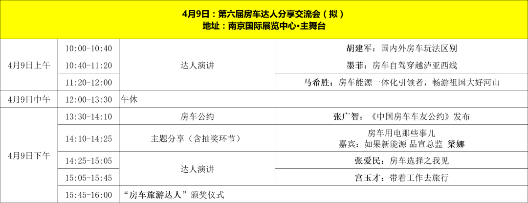 当然,除了露营服务之外,主办方还将开展“第六届房车达人分享交流会”,邀请了张广智、老约翰、马希胜、宫玉才、墨菲、张爱民等房车达人就国内外房车玩法区别、房车自驾穿越沪亚西线、畅游祖国大好河山、房车选择之我见、带着工作去旅行等一系列主题进行深入分享、演讲。同时现场还将举行有关《中国房车车友公约》的倡议活动!为营造良好房车生活环境发声!