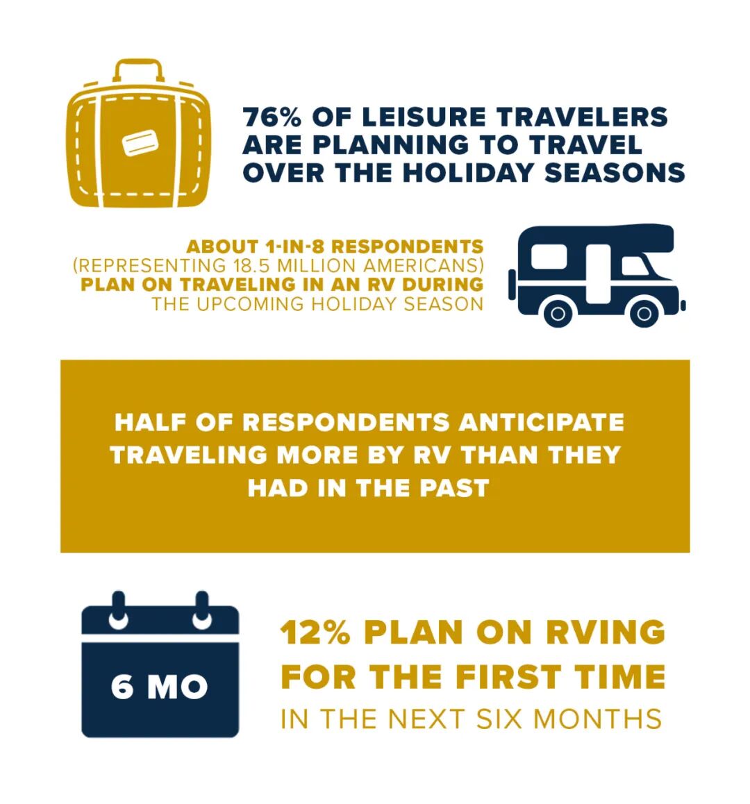 旅行动机方面,对于探索户外活动的兴趣、远程工作/学习的灵活性以及想用更多的时间和家人、孩子一起旅行仍然是人们计划去房车旅行的主要原因,旅行优先级上,越来越多人将房车旅行作为探索户外的最佳旅行方式;而在假期度过方式上,根据调查结果显示,76% 的休闲旅行者计划在假期(定义为感恩节到新年)期间旅行,其中大约八分之一的受访者(代表 1850 万美国人)计划在即将到来的假期期间乘坐房车旅行。