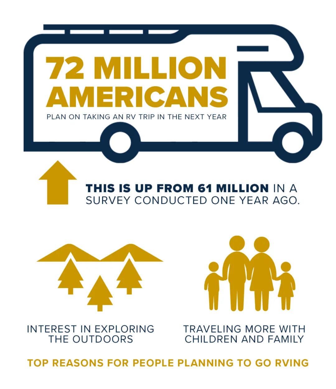 旅行生活观念方面,受疫情全球化、经济动荡等因素影响,过去一年里,美国人的旅行生活观念正发生着改变。根据美国房车工业协会(RVIA)公布的另一项调查显示,相比2021年的6100 万人,2022年有近7200 万美国人计划使用自有、租赁或借用来的房车进行房车旅行。