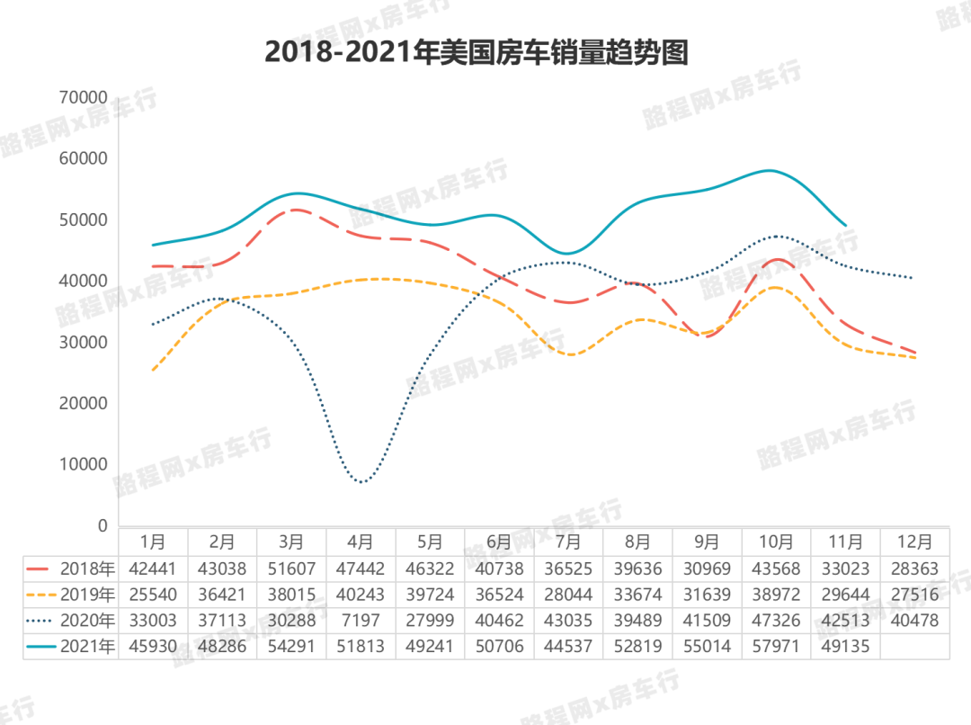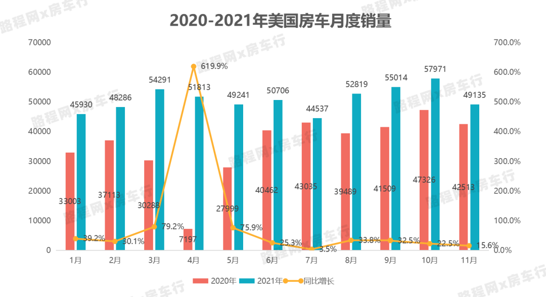 2021年12月初,美国房车工业协会(RVIA)总裁兼首席执行官雷格·柯比(Craig Kirby)表示:“2021年房车制造商和供应商已经取得前所未有的成就,根据前十一月房车出货量趋势判断,预计2021年年底房车销量将在593600~610800辆之间,最有可能在年底达到602200辆,与2020年的430412辆相比增长近40%。” 而根据前十一月房车销量增长数据来看,预测全年实现40%增长率的可能性非常高。