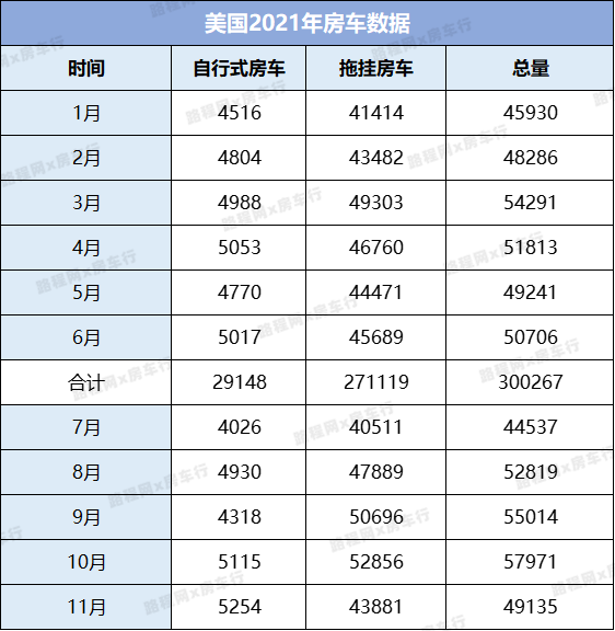 2021年美国房车增速迅猛,前十一个月房车总销量为559743辆,相较2020年前十一月的389943辆,同比增长43.5%。其中,自行式房车总销量达到52791辆,相较于2020年前十一月的36825辆,同比增长43.4%;拖挂房车总销量为506952辆,相较于2021年前十一月的353109辆,同比增长43.6%。