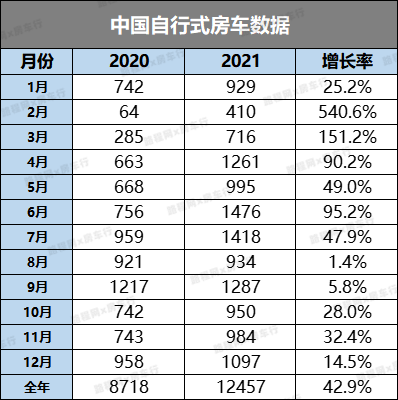 2021年作为“十四五”开局之年,在进一步促进大宗消费、重点消费等相关政策影响下,国内旅游市场逐步复苏,房车露营市场也在持续快速增长,年度销量全面超越往年,再创新高——根据路程网x房车行相关数据统计显示:2021年1-12月,国产自行式房车总销售数量由2020年的8718辆飙升至12457辆,同比增长43%。