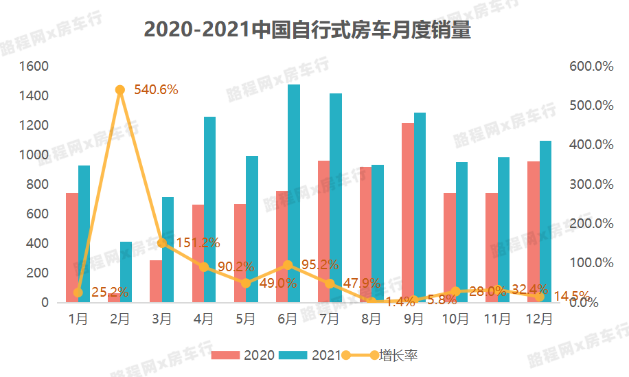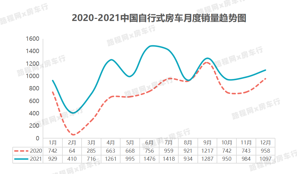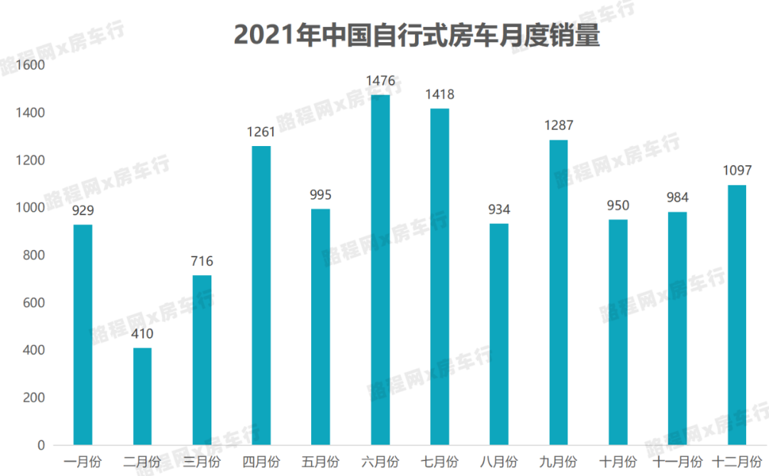 2021年1-12月,共有10个月的单月销量突破900辆,其中,突破千辆的有5个月,突破1200辆的有四个月,还有两个月的月度销量突破1400辆大关,分别是6月份的1476辆以及7月份的1418辆,这也意味着,在国内,房车作为新兴行业在疫情之下正焕发出新的生机。