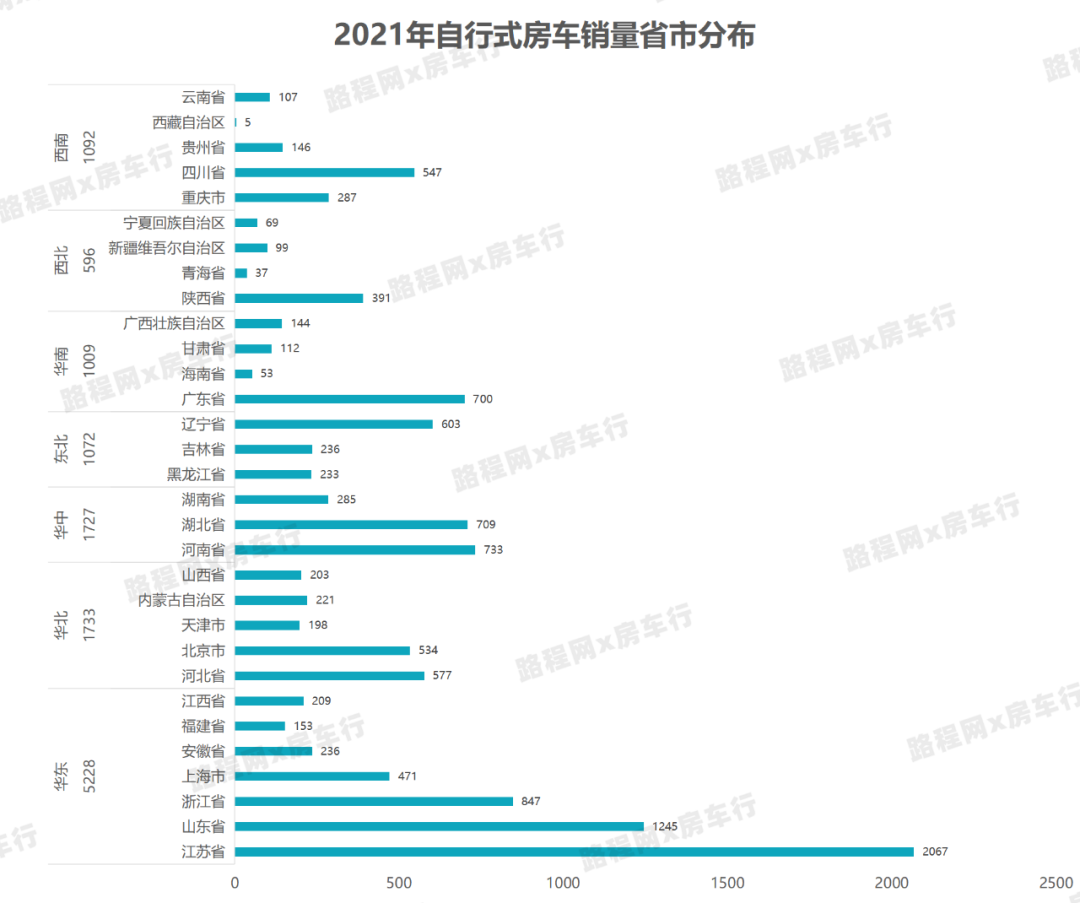 国产自行式房车销量省市分布特征上,2021年全年,江苏省以2067辆的销售数据荣获销量排名第一,山东省则以1245辆的销量排名第二,而其它省市,如浙江省(847辆)、河南省(733辆)、湖北省(709辆)、广东省(700辆)、辽宁省(603辆)、河北省(577辆)、四川省(547辆)、北京市(534辆)、上海市(471辆)等也都有着不错的表现。