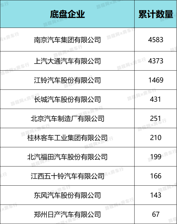 国产自行式房车底盘方面,南京依维柯与上汽大通分别以4583辆、4373辆位列底盘企业断层一、二名,成为更多房车改装厂中意的选择;江铃底盘则以1469辆名列第三。