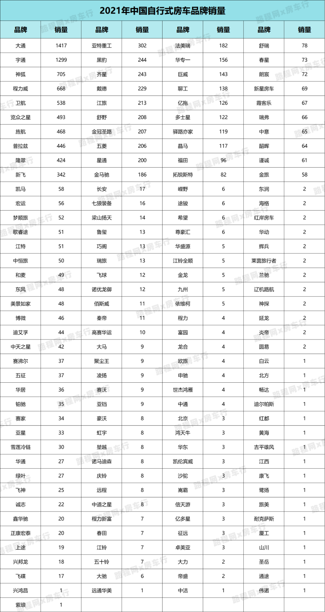 此外,诸如神狐(湖北合力特种车辆制造有限公司)、程力威、戴德隆翠、卫航、览众、旌航、瑞弗(普拉兹)、新飞、亚特重工、黑豹、齐星、江旅、舒野、金冠、五菱、星通、金马驰、法美瑞、华专一、巨威、聊工、亿拖、多士星、驿路亦家、晶马、福田、拓锐斯特等国产自行式房车品牌也均取得不错的销量,这里也祝愿各大房车厂商在新的一年里,可以续写荣耀,再创辉煌。