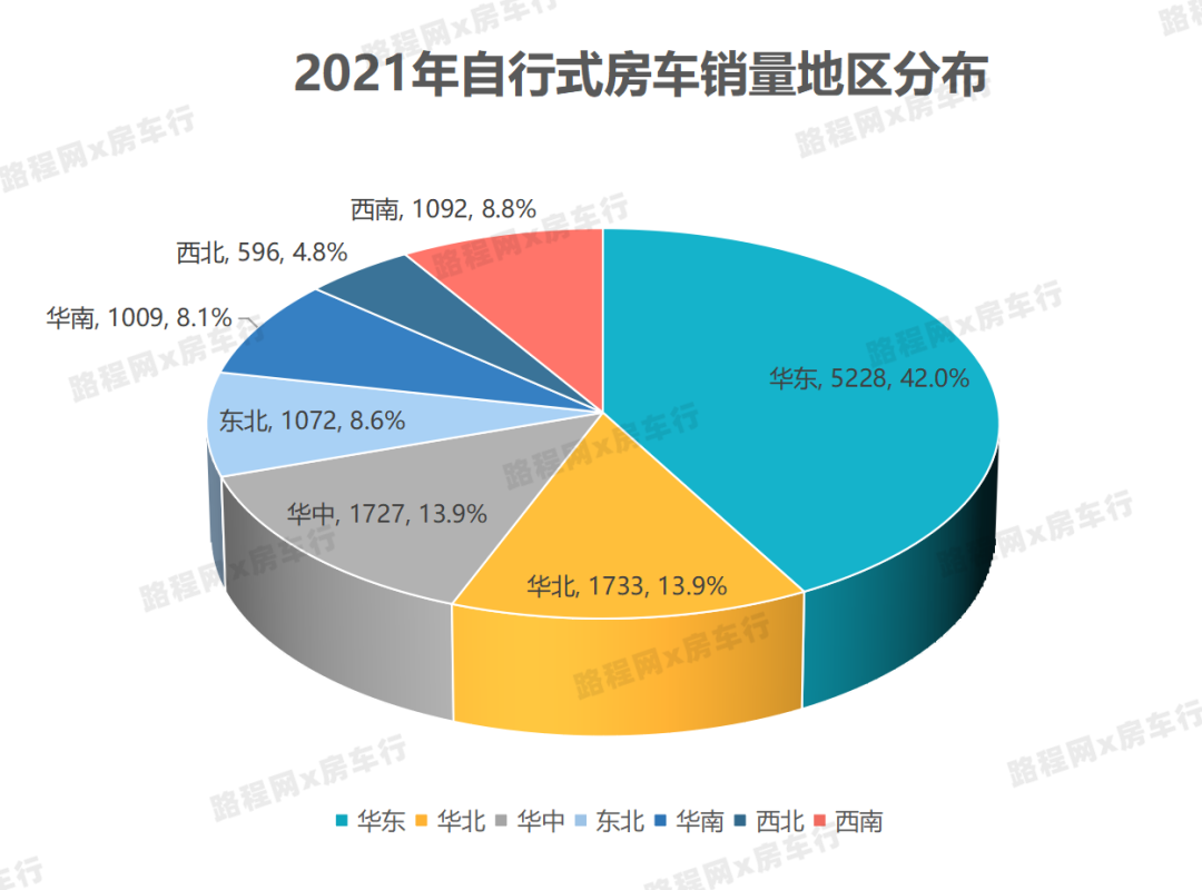 从自行式房车销量地区分布来看,2021年全年,华东地区依旧以5228辆,占比42%的销量数据遥遥领先,其后依次为华北地区1733辆(占比13.9%)、华中地区1727辆(约13.9%)、西南地区1092辆(占比8.8%)、东北地区1072辆(占比8.6%)、华南地区1009辆(占比8.1%)、西北地区596辆(占比4.8%)。