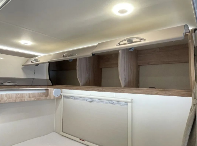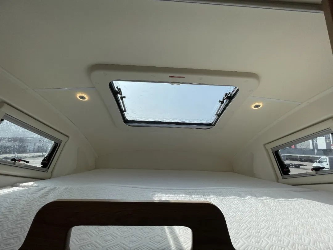 额头休息区位于驾驶室上方,设置了一张双人床,供日常休息使用;床面铺设舒适透气性床垫,提升睡眠质量;采光通风方面设有顶部天窗、两侧外推窗,可快速更新车内空气;床侧还配备隐私帘,保证睡眠空间的隐私性。