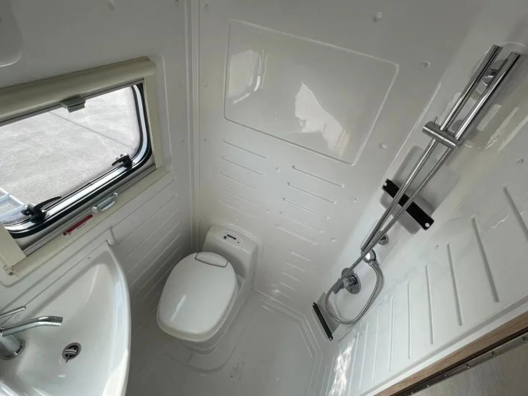 吸塑一体式防漏水卫浴区,空间利用高效,内部配备了换气扇、照明灯、C200座便器、淋浴花洒、化妆镜,可满足日常卫浴、盥洗需求;卫生间设有感应式壁灯,方便夜间使用;侧面设有外推窗,与换气扇搭配可快速更新空气。