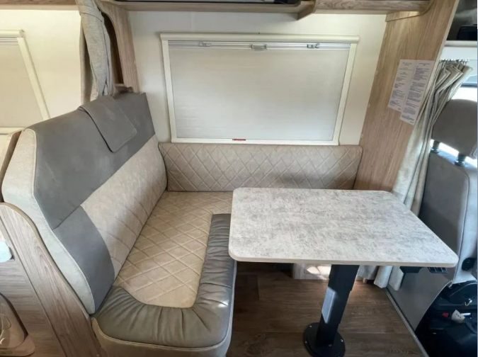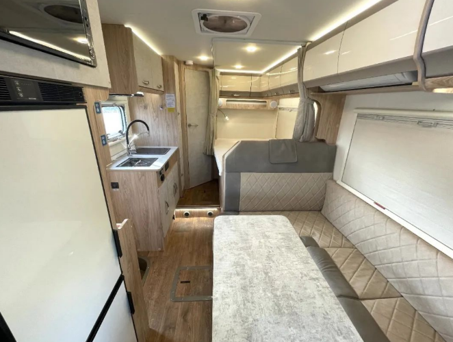 驾驶室后方是会客区,采用空间利用高效的L型沙发卡座布局,可满足多人乘坐休息;沙发配备皮革包覆座椅,乘坐舒适,透气性好;中间位置设有可升降餐桌,与卡座搭配可拼成单人床,增加车内休息空间。