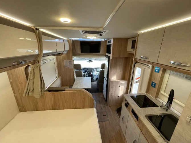 驾驶室后方是生活区,与驾驶室之间采用贯通式设计,进入后方空间更加方便;内饰采用豪华家具组+防水地板革组合,同时配备布艺窗帘+纱窗,提升旅行生活的品质;空调系统配有1.5P分体式变频空调,保证车内温度适宜;娱乐系统配有32寸显示屏、网络盒子、影音系统,丰富旅居娱乐生活;车内还配备四路监控系统,为旅行安全保驾护航。