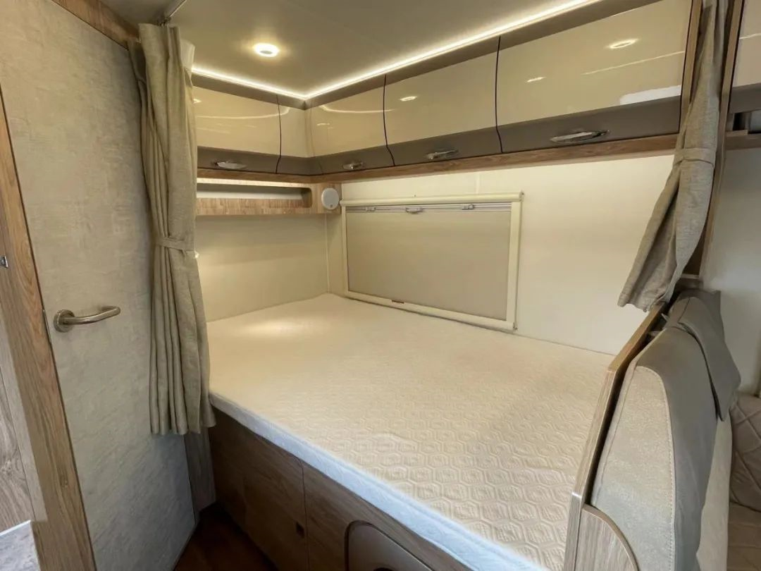 尾部固定休息区设有纵置床,配有阅读灯、USB接口、充电插座等,提供了一个舒适的睡眠环境;床的侧面设置了车窗、隐私帘,保证日常采光通风及睡眠空间的私密性。