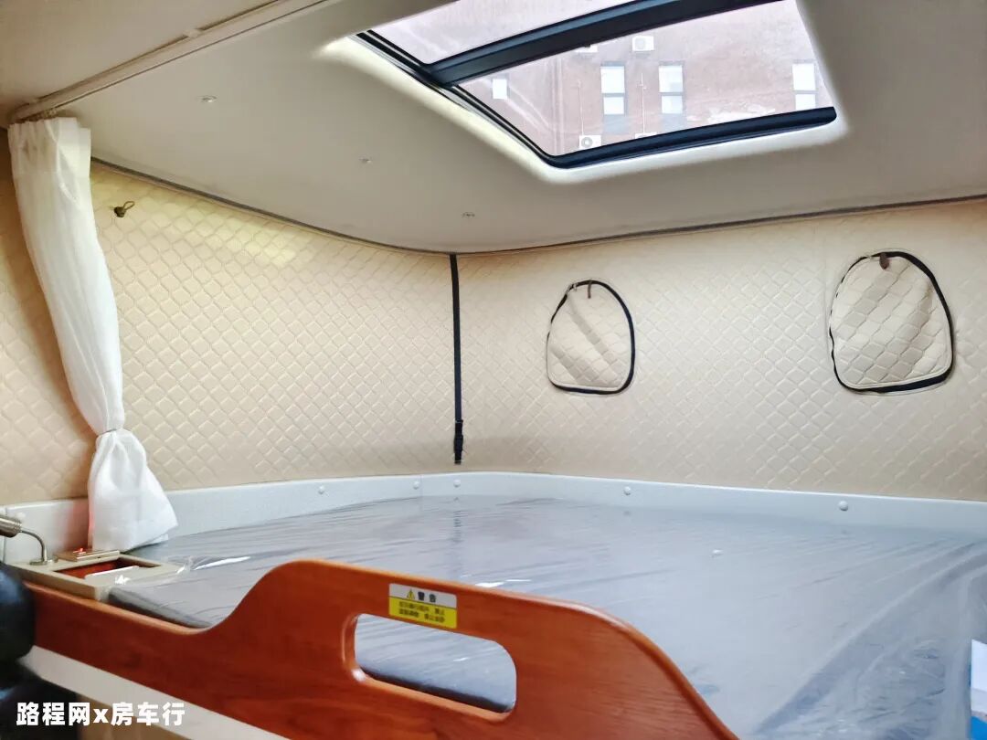 休息区位于会客区上方,设有豪华双人床,铺设乳胶床垫(豪华型铺设高密度海绵床垫),睡起来十分舒适;升顶结构采用防割保温隔音篷布,保温隔热效果良好;顶部还设有全景电动天窗,打开后可加快内部空间通风。
