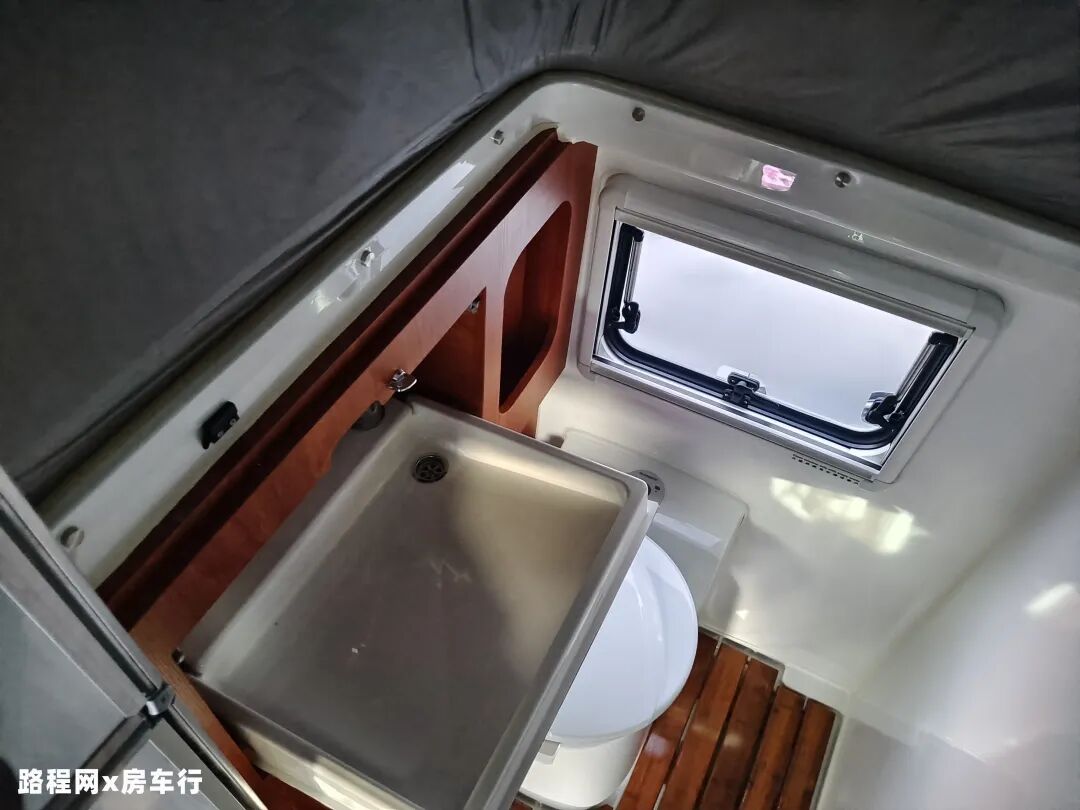 卫浴区位于房车尾部,采用折叠式独立密封卫浴间设计,配备了进口盒式式马桶(豪华版采用直排式马桶)、洗手盆、抽拉式淋浴花洒、驻车水暖加热器等,可满足日常梳洗、卫浴需求;地面铺设防水防滑柚木地板,防滑、防潮、防磨效果非常好。