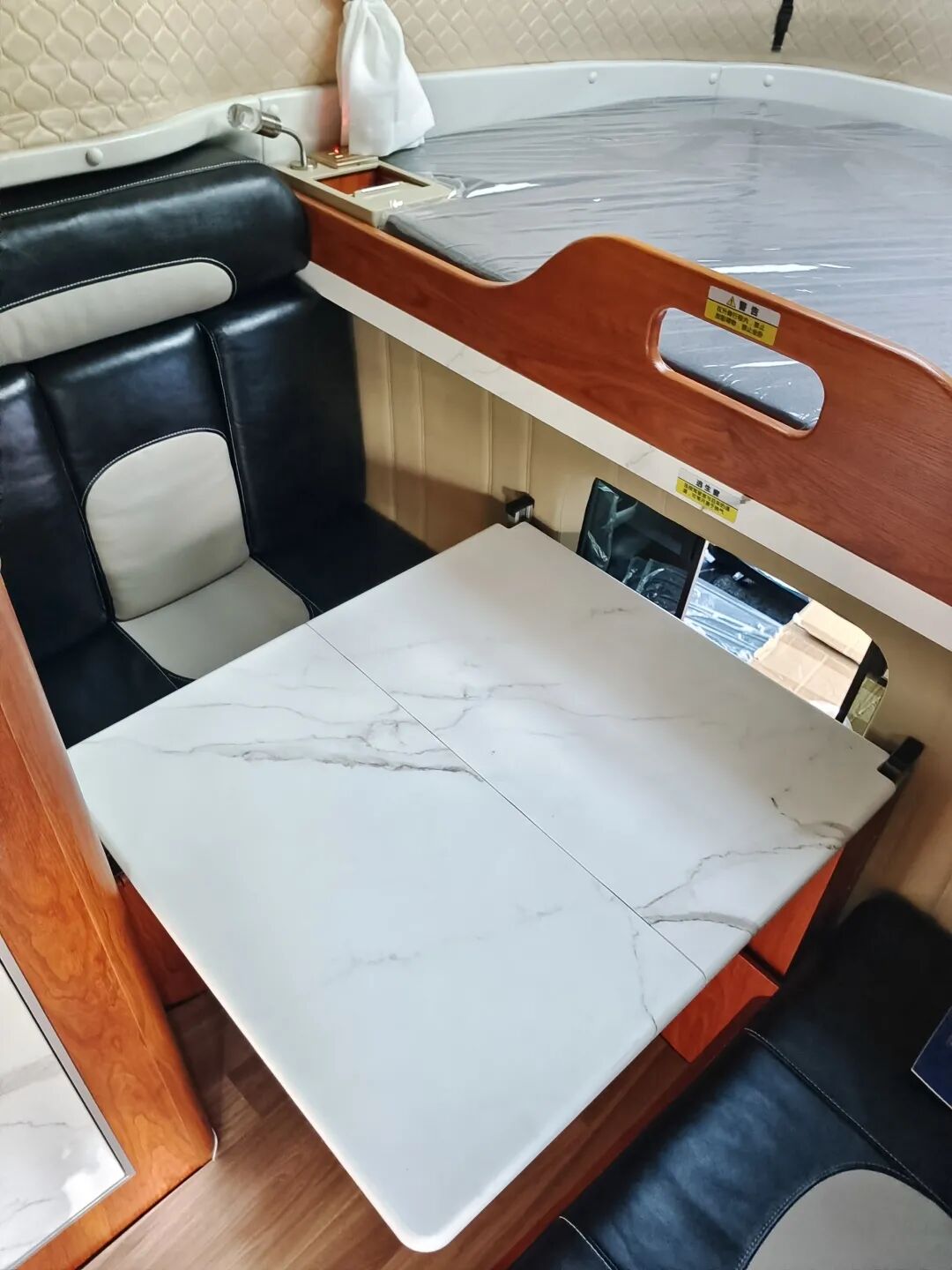 会客区紧邻厨房区,设有真皮(豪华版布艺材料)材料的对向沙发座椅,可满足多人乘坐休息,也可与中间的多功能隐藏式电动升降桌拼床,供日常休息使用;地板铺设柚木地板(豪华版为地板革),脚感舒适,耐磨耐污,清洁起来也非常方便;沙发侧面设有窗户,打开后可以与驾驶室交谈。