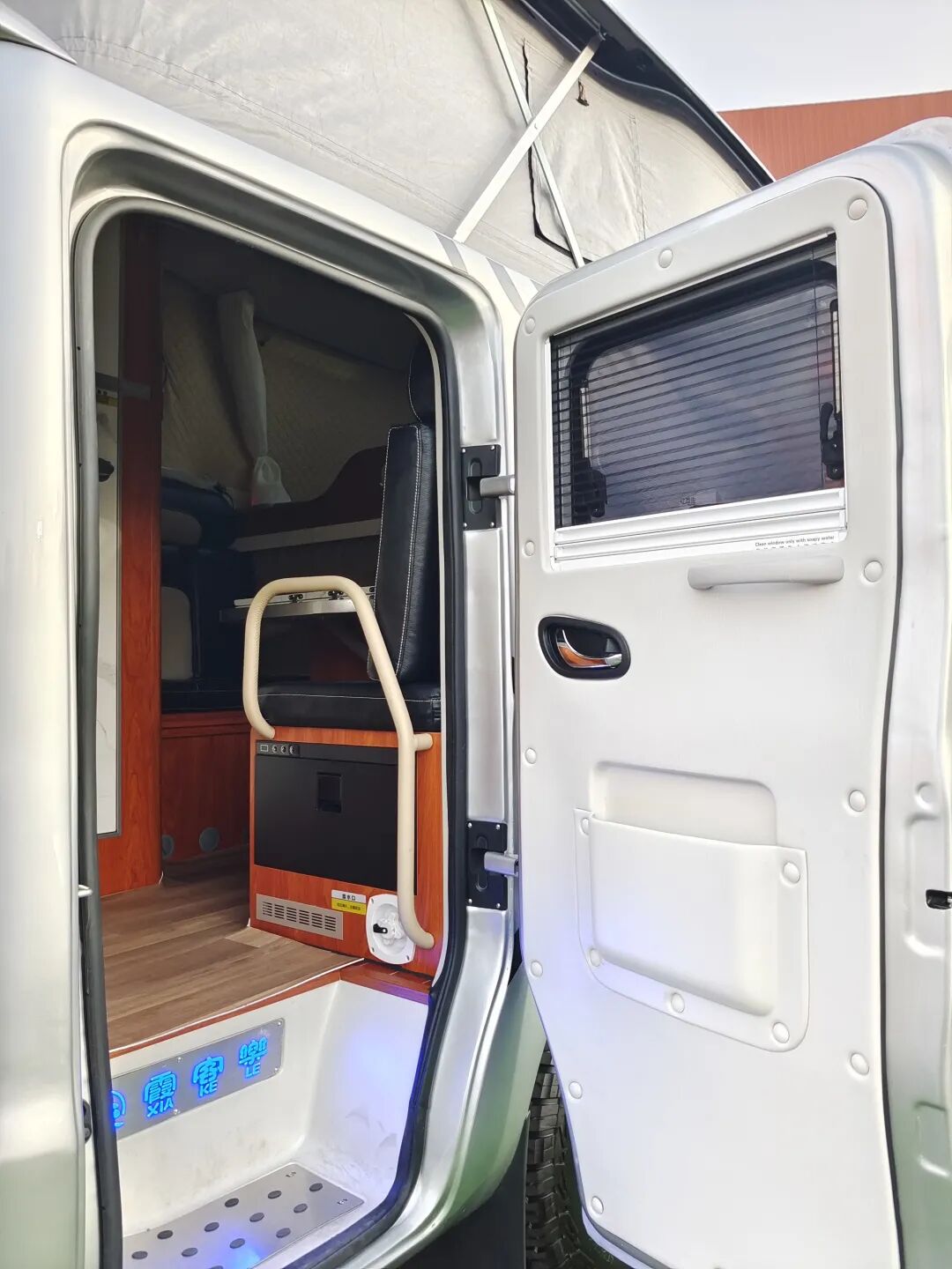 乘车门位于车的后方,入口处设有不锈钢上车扶手方便上下,扶手下方配置了30L房车专用冰箱,用于储存食物。