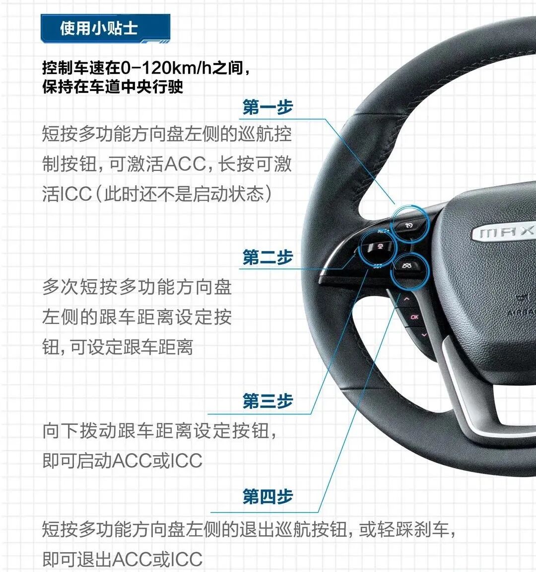 全速ACC自适应巡航控制与ICC智能领航系统需由驾驶者手动激活,具体操作步骤见下图: