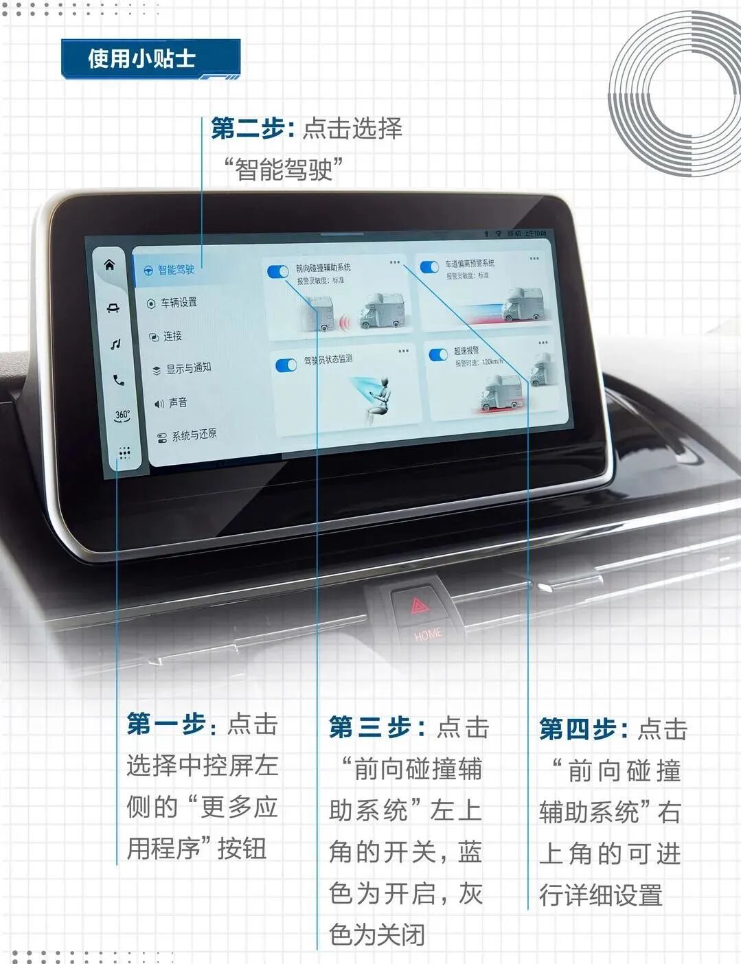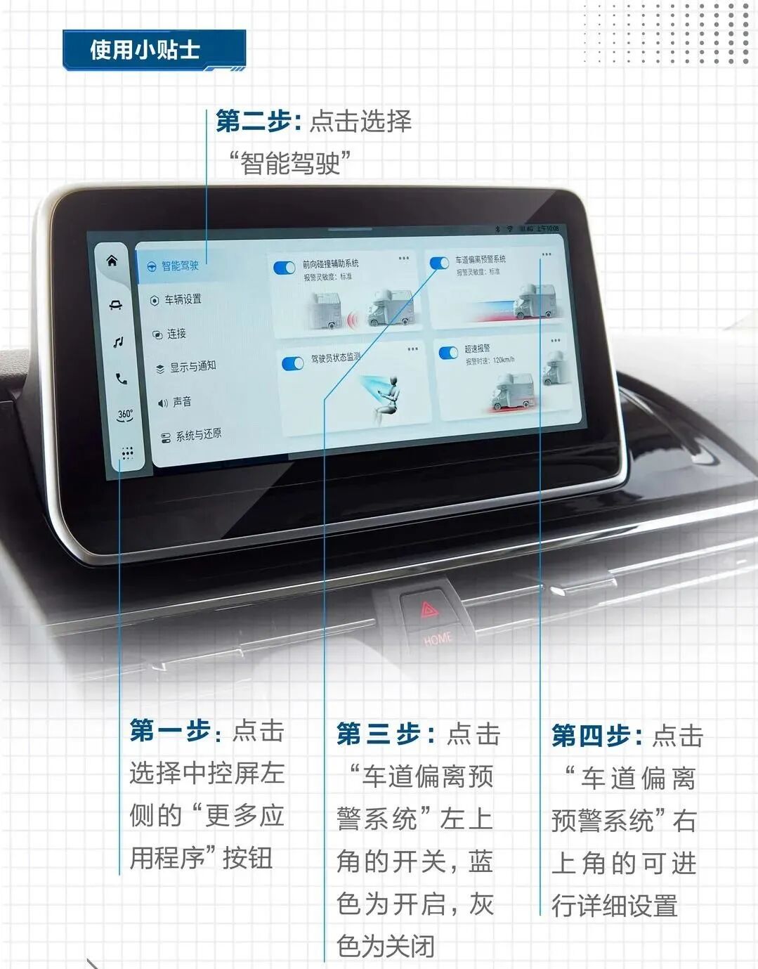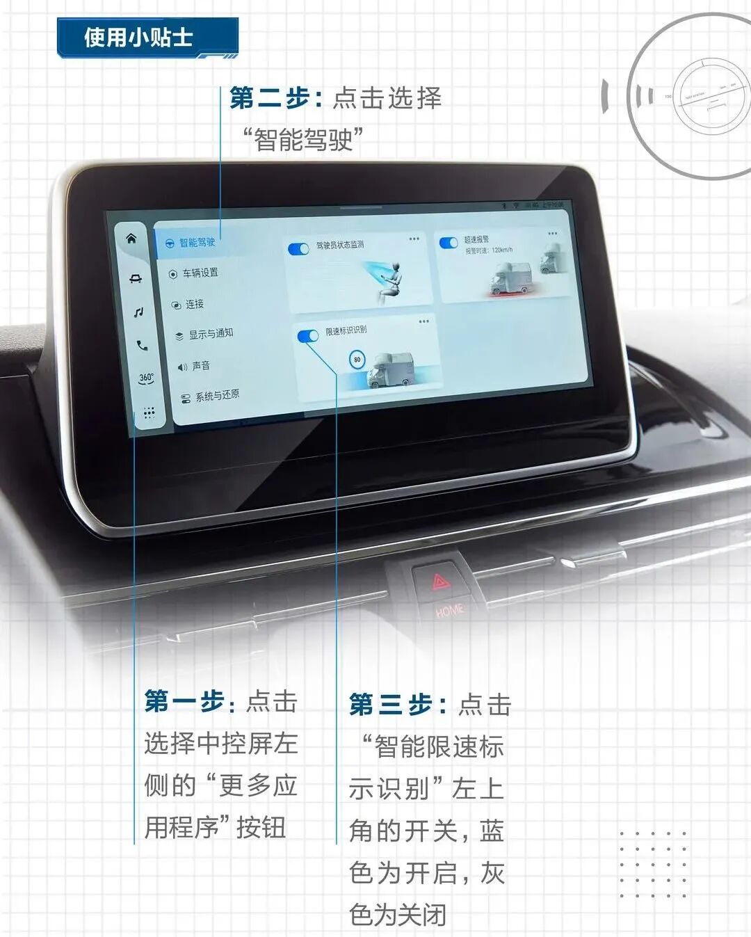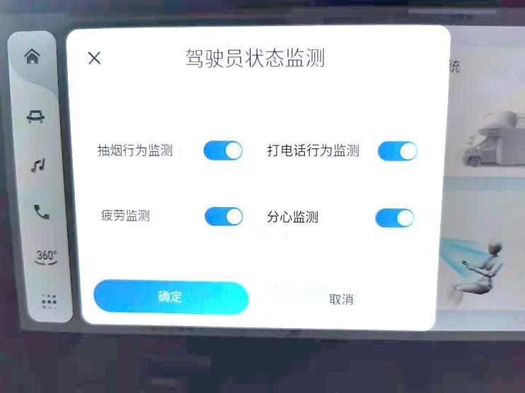 用户可以通过中控屏设置需要监测的危险驾驶行为,具体操作步骤如下图:
