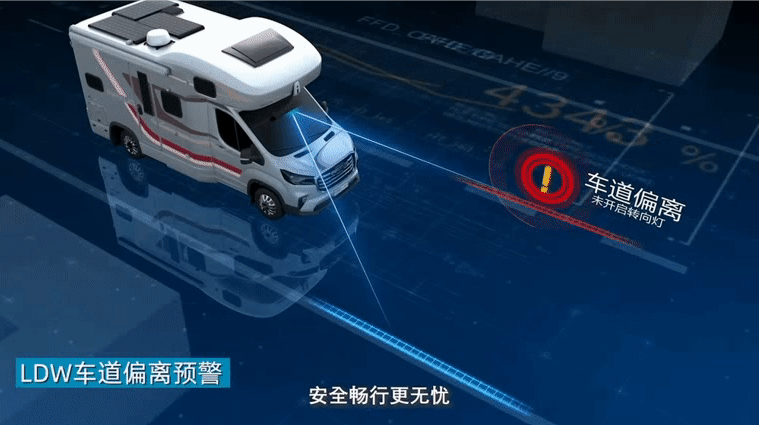 车辆处于60-120km/h的车速区间行驶时,当LDW车道偏离预警系统检测到房车偏向一侧车道线且没有开启转向灯,就会通过仪表画面提示压线情况,提醒驾驶者及时纠正行驶方向,避免发生危险。