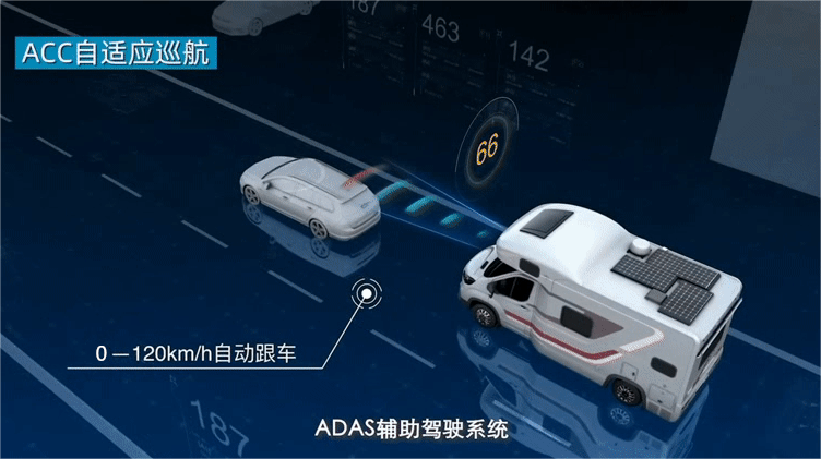 普通ACC自适应巡航在高速巡航遇到堵车情况发生时,虽然可以控制车辆降至低速,但仍需要驾驶者接管车辆,控制车辆刹车直至完全刹停;而全速ACC自适应巡航控制可以做到自动将车辆完全刹停,并在前方车辆起步后自动起步、跟车,从而“解放”双脚,提升高速驾驶房车的舒适度。(注:仅作为驾驶辅助功能,驾驶者要时刻准备接管车辆控制)