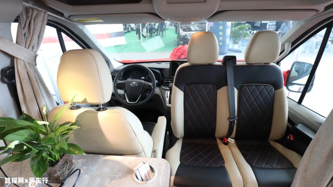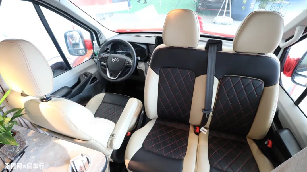 驾驶舱整体视野良好,内部配置了原车倒车影像、多功能方向盘等设施辅助驾驶;副驾驶座椅选用双人座椅,加上主驾驶位,驾驶舱内可乘坐三人;主副驾驶座椅均可旋转,同时副驾驶座椅带有滑轨,日常使用相当方便;