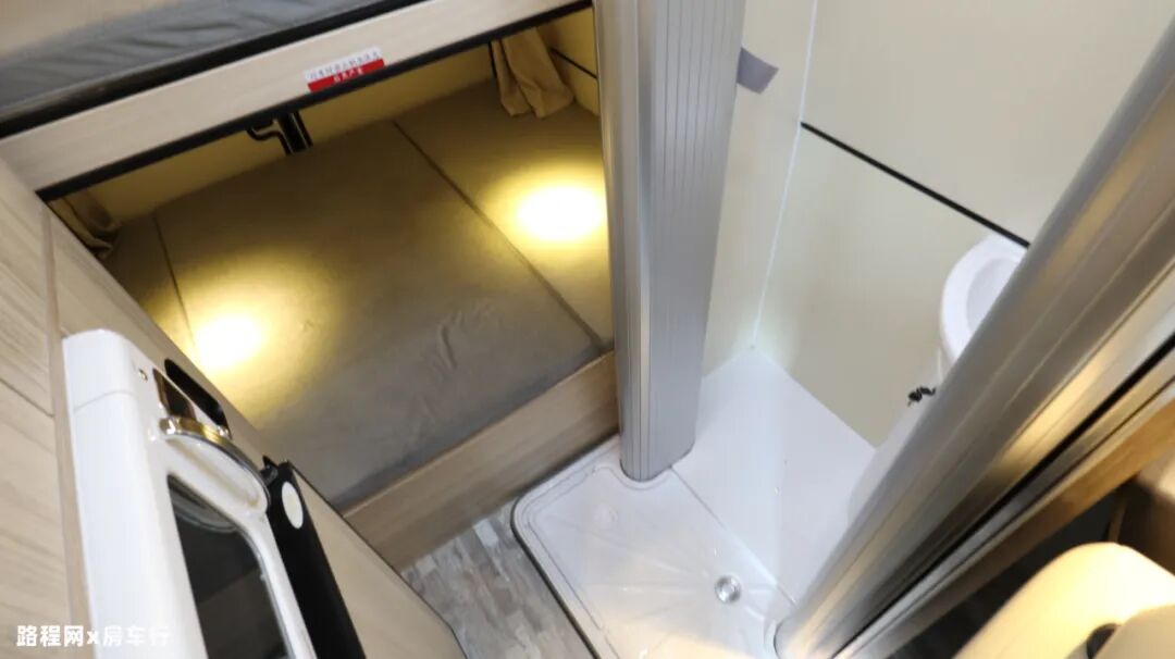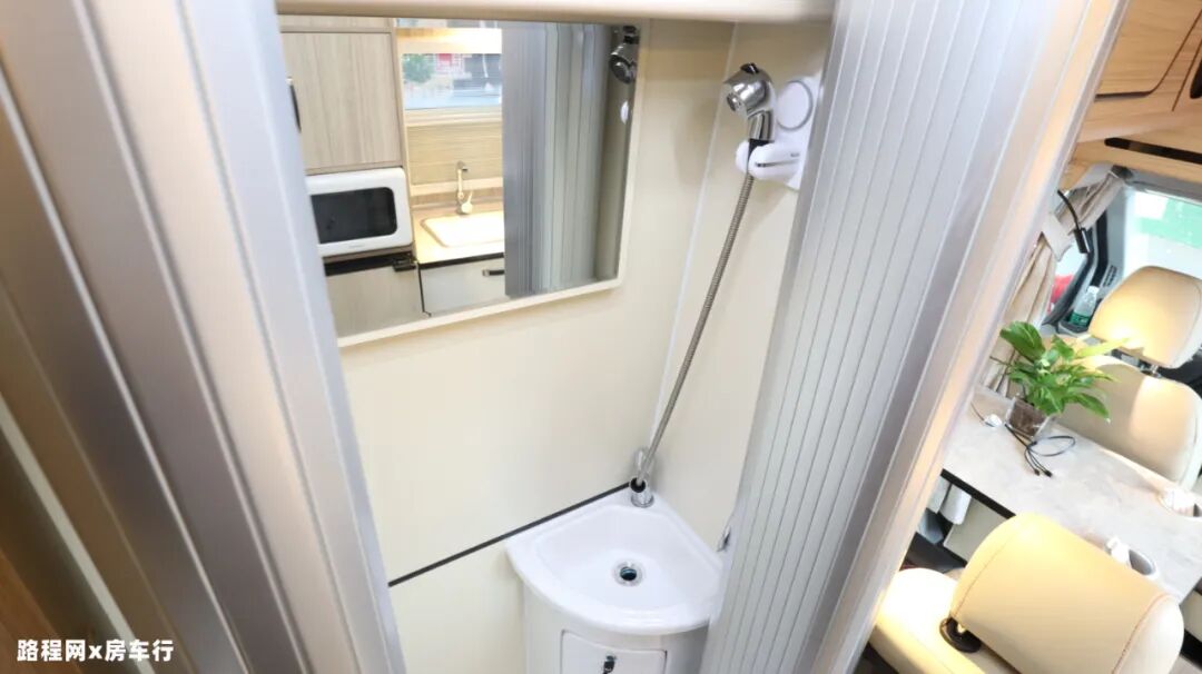 这款车的卫浴间是一大亮点,新颖的采用对开卷帘门的设计,在不使用时有效减少占用空间;内部配置也很齐全,固定盒式马桶、折叠水盆、防水竹板、带灯换气扇、浴镜、毛巾架、淋浴花洒等卫浴设施均具备,充分满足日常卫浴使用的需求;
