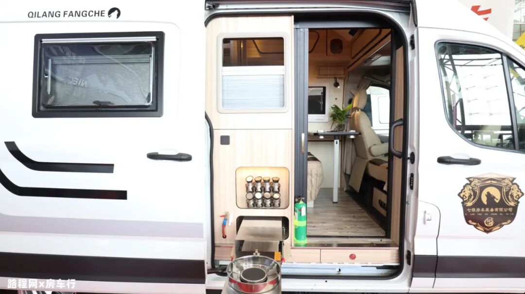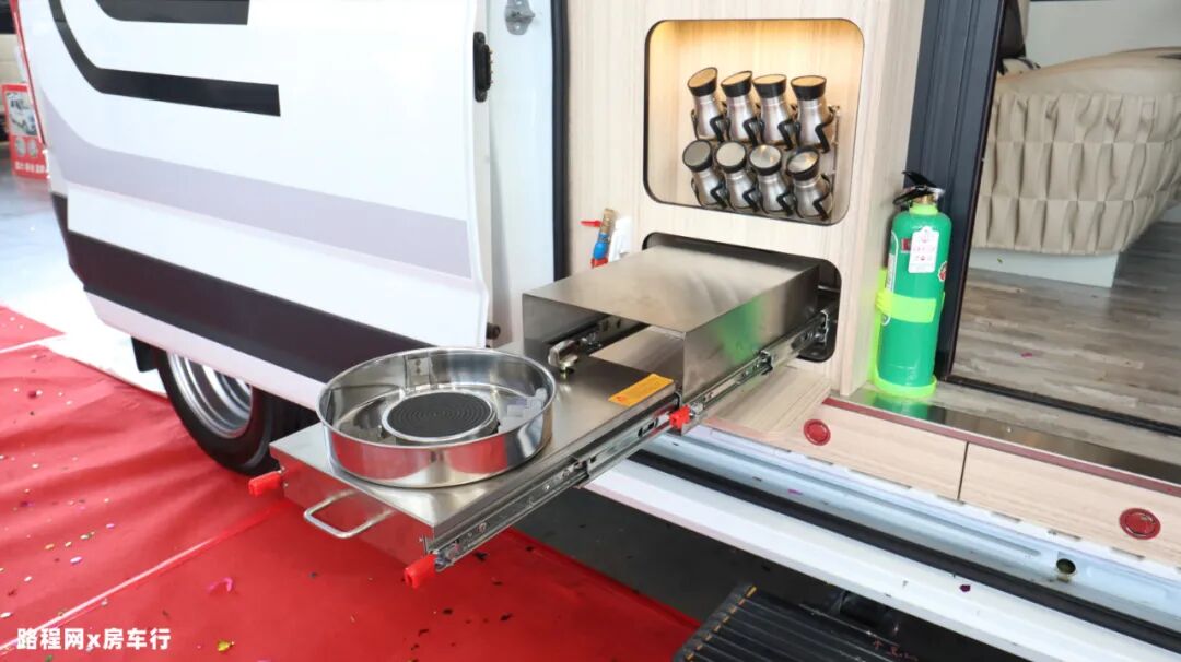 中门内侧设计了一个外置抽拉灶,驻车时把中门打开,抽出灶台即可使用,同时灶台藏身处上方还配有调料瓶放置柜,人性化的贴心设计,充分满足日常室外烹饪的需求;