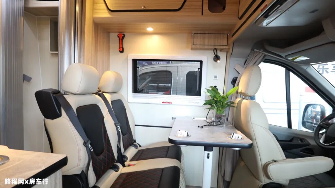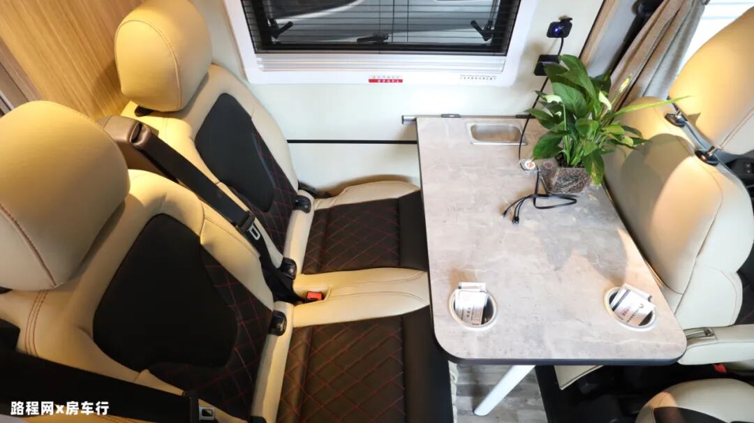 会客休闲区位于主驾后方,选用奔驰威霆双人座椅增强舒适度;同时配有可拆卸餐桌(含杯托、垃圾盒),不需要使用时可拆下,减少空间占用面积;侧方设有外推窗,加强日常采光、通风效果,同时也可用于欣赏沿途的风光;