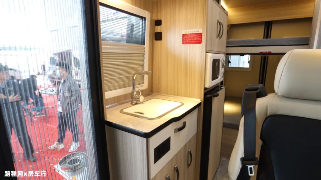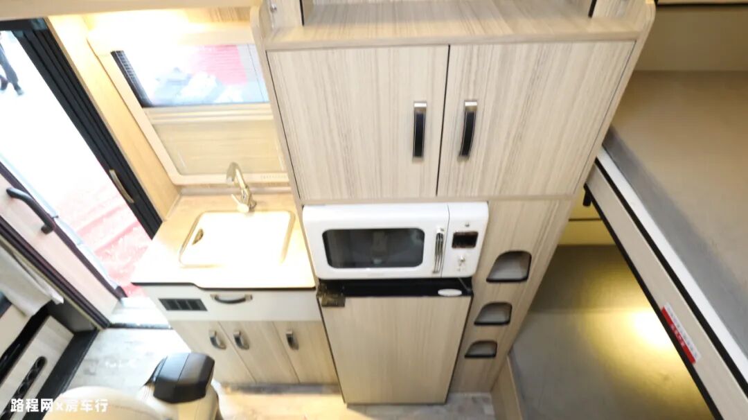 厨房区在主门右手边的位置,一体式橱柜设计,内部配置了切菜板、水龙头、洗菜池、储物柜、电磁炉、大宇微波炉、85L车载冰箱等厨房设施,充分满足日常烹饪的需求;