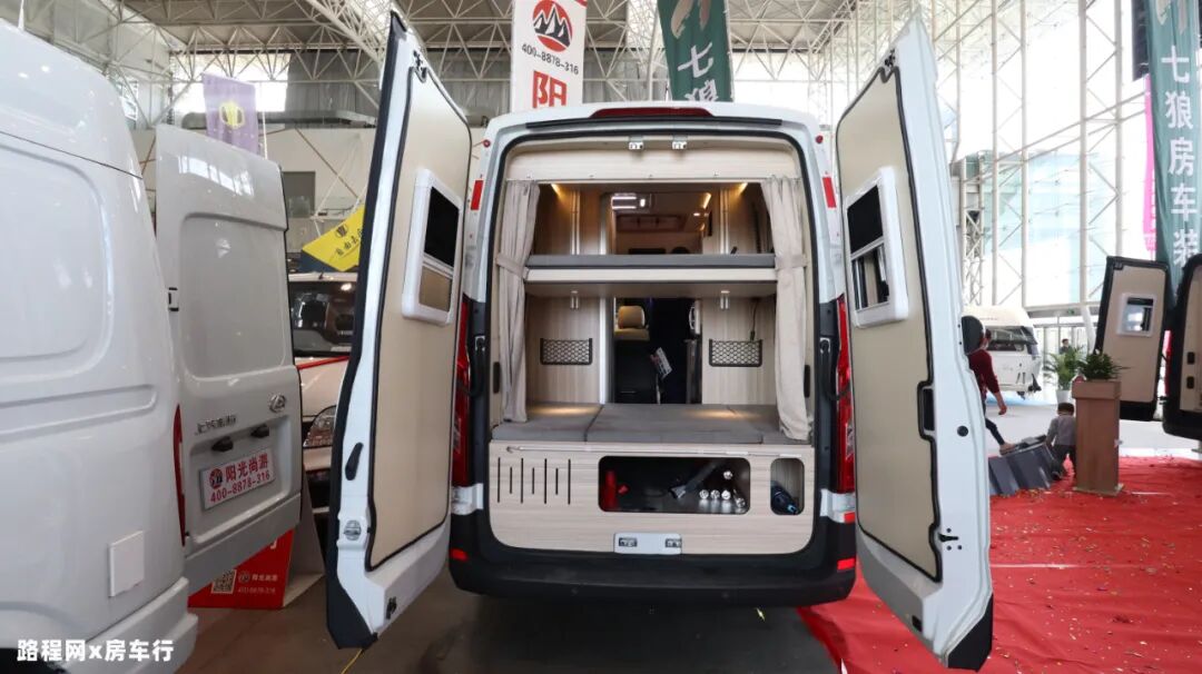 尾部选用对向双开门的设计,驻车时可完全打开,内部配有一张上下铺,底部设有储物舱;
