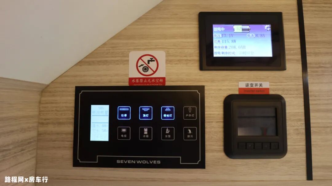 车内主门上方为中控区,屏幕内车内水电状况一目了然,同时也可以通过它操控车内水电灯等设施的运作,操作起来相当简单、方便;