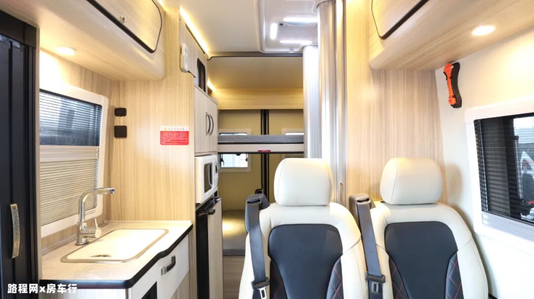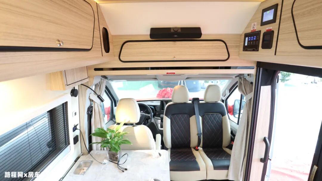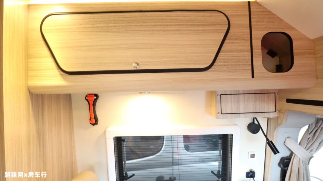 内部家具整体选用轻量板材家具,减轻车身载重的同时,旅居舒适度亦有增强;除此之外,为保证车内亮度,车内顶部设有LED射灯、多组氛围灯、超薄吊柜灯加强照明;
