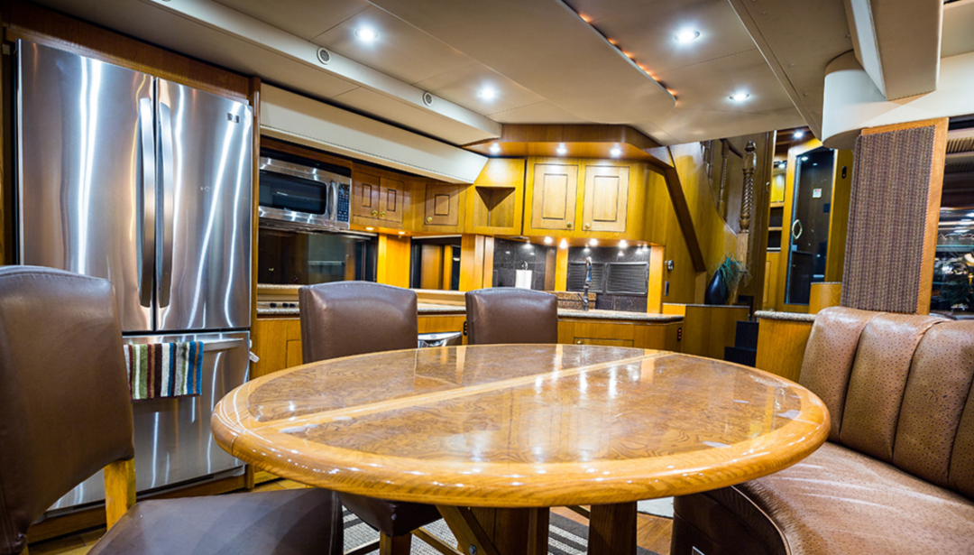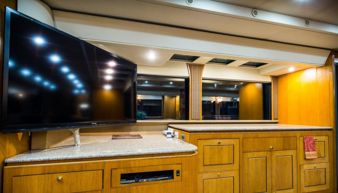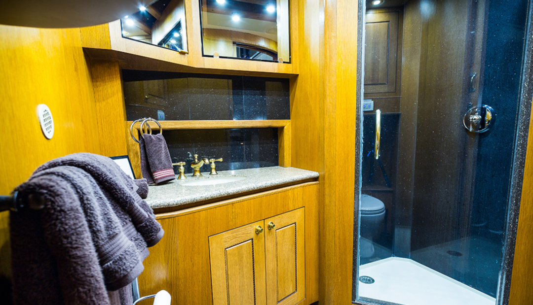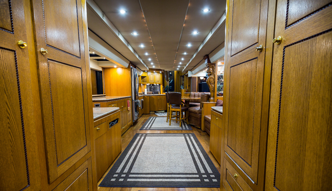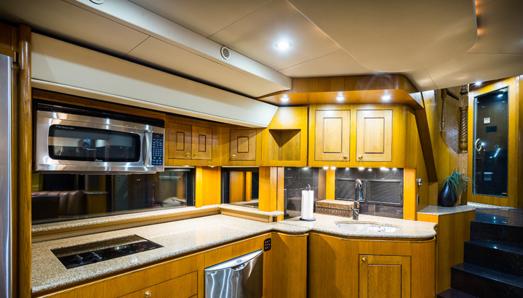 厨房装修奢华大气,台面采用了天然的大理石,洗手池用了隐藏设计,不用时可以随时盖上大理石,保证房车内饰的美观。配备了一流的电器,如三门冰箱、洗碗机等。电器价值高达20万美元,折合人民币约120多万元。