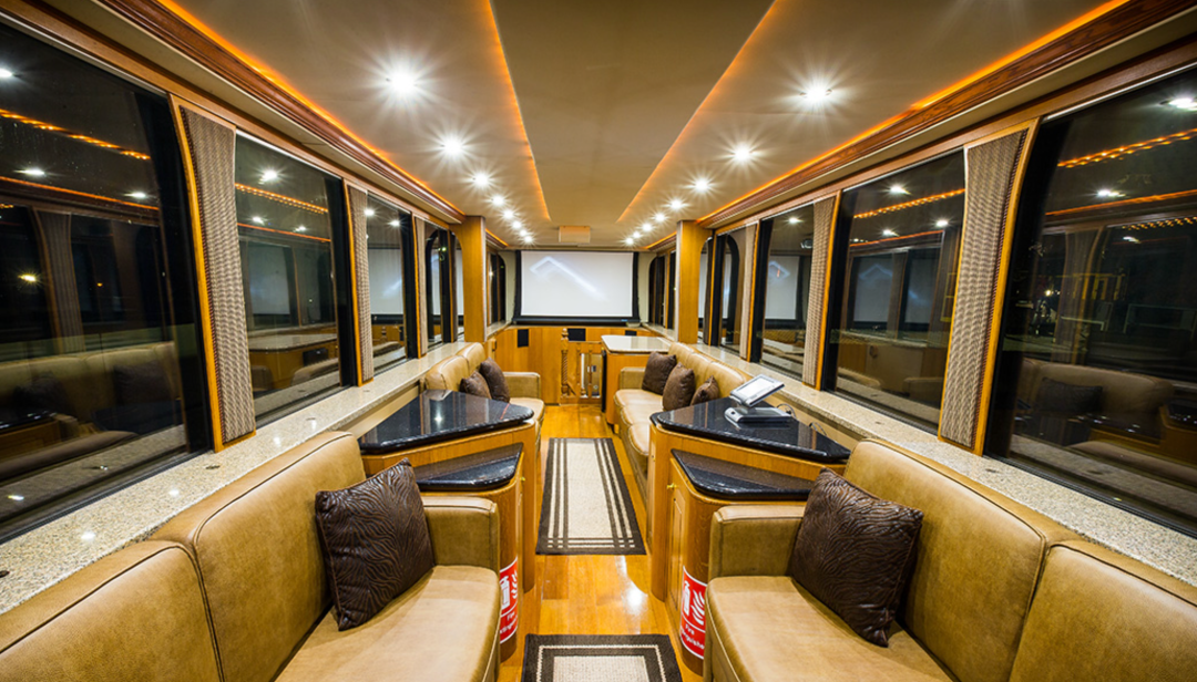 该车的餐厅十分宽敞,设计有拼接圆桌,可容纳下12人就餐。同时卧室的床可折叠变成沙发,卧室的顶部还有一个设计有应急出口,以备不时之需。