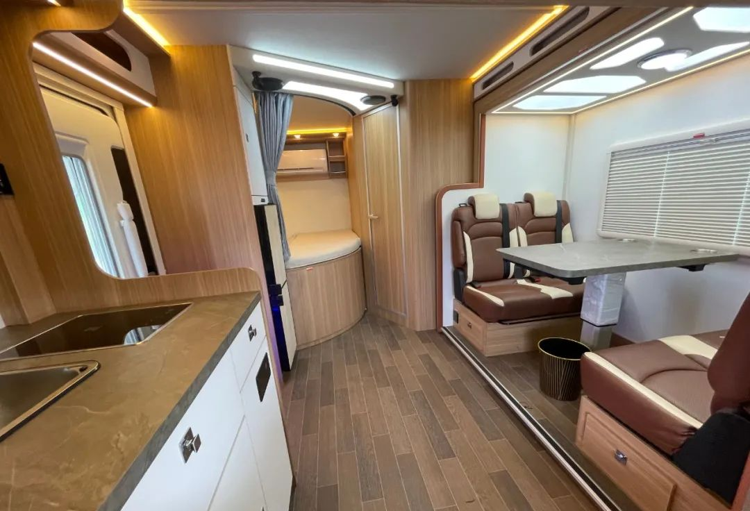 汽车钢化玻璃超大全景窗也是一大亮点;车内设有环形大卡座,中间是升降式餐桌;环形卡座可拼床供临时休息使用,拼床尺寸达到2x2.15m,可容纳多人睡眠。