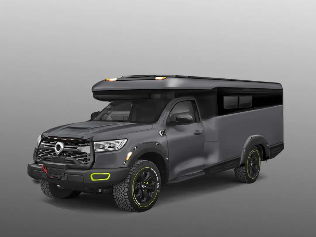根据以往资料,我们可以看到这款房车有着硬朗的造型,磨砂灰黑色车身,搭配荧光黄的点缀,颇有些特装版的味道,充满活力,野性十足;此外,这款房车还升级了专门的越野套件,越野轮胎加上熏黑轮毂,着实为整车颜值增色不少。车身外观依然保留了长城炮比较威猛霸气的造型,尤其是车头前方宽大的横幅式前格栅,也为全车带来了比较明显的辨识度。