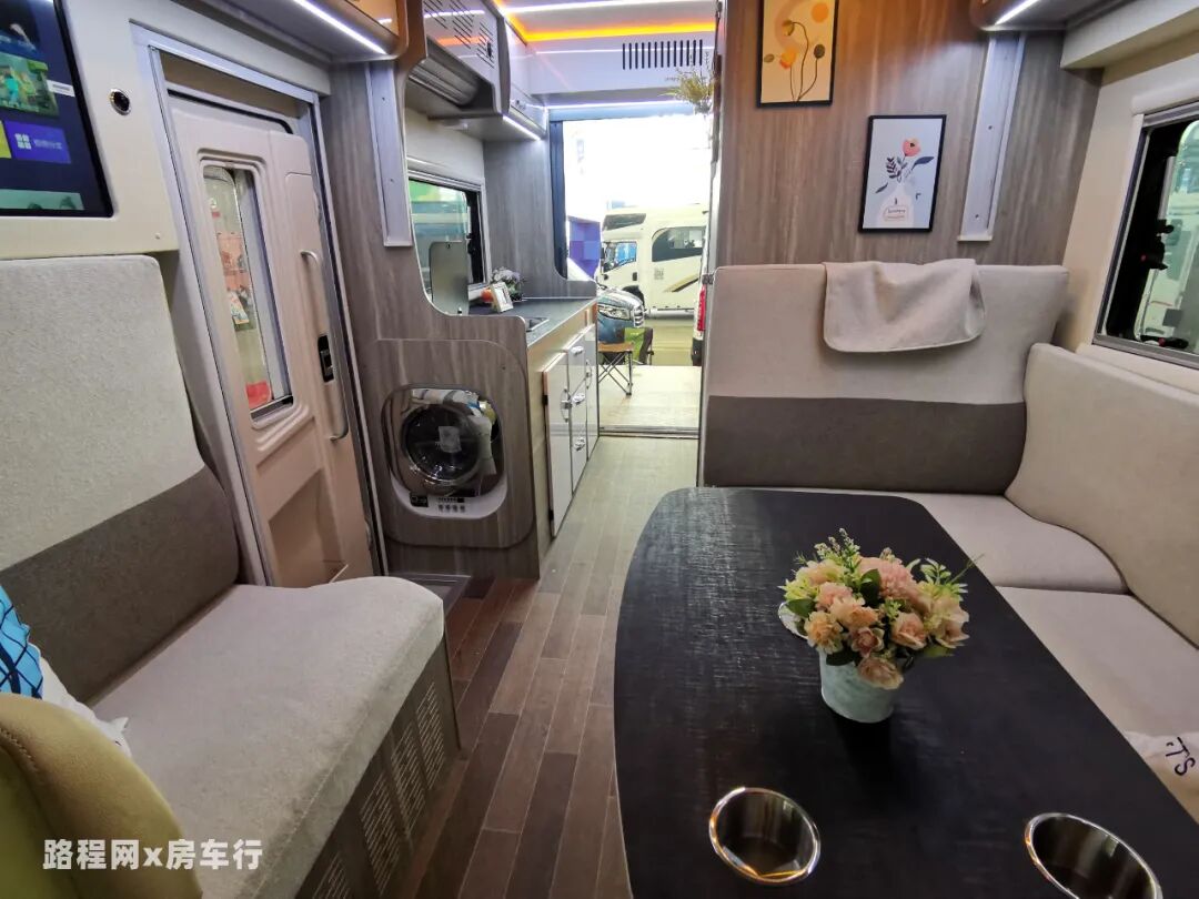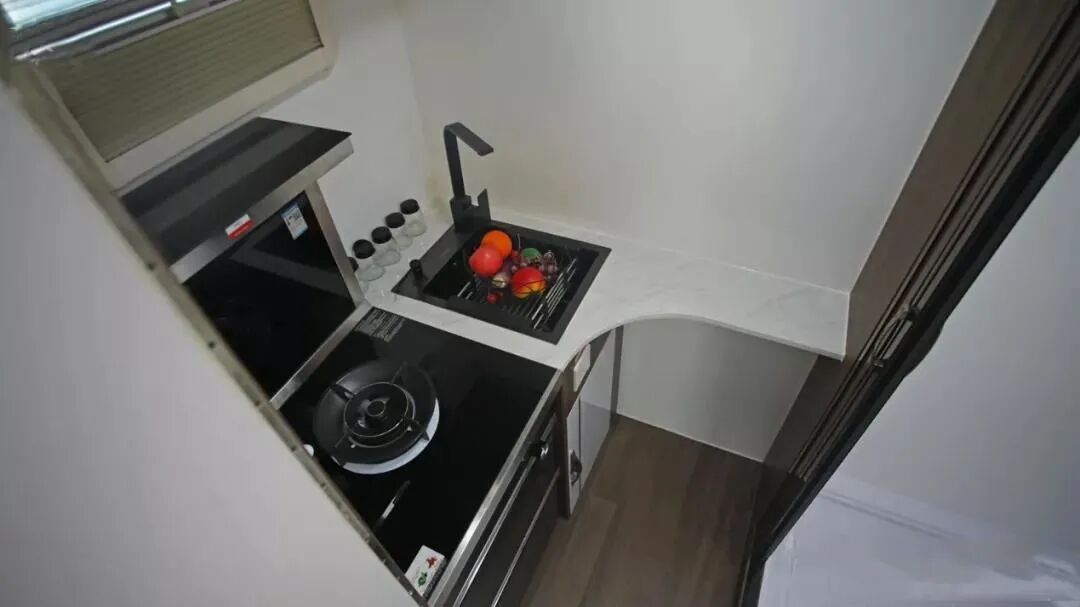 客厅单排双人座椅+可移动旋转式(带拓展小桌板)餐桌方便行车时载人;厨房区设有带砧板的不锈钢洗菜池、折叠小桌板、水龙头、电磁炉等,满足车上烹饪需求。