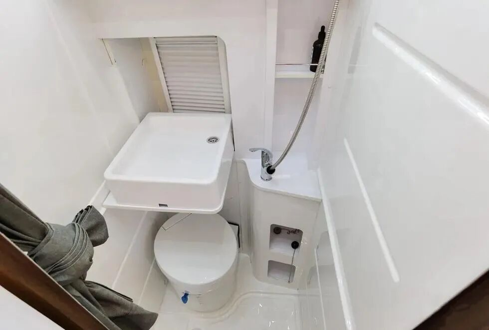 防水处理过的独立卫浴间内部进口赛特福德房车专用抽拉式马桶(可选装进口电动粉碎马桶)、大宇3KG洗衣机、洗漱池、淋浴花洒、换气扇、储物空间等卫浴设施一应俱全。