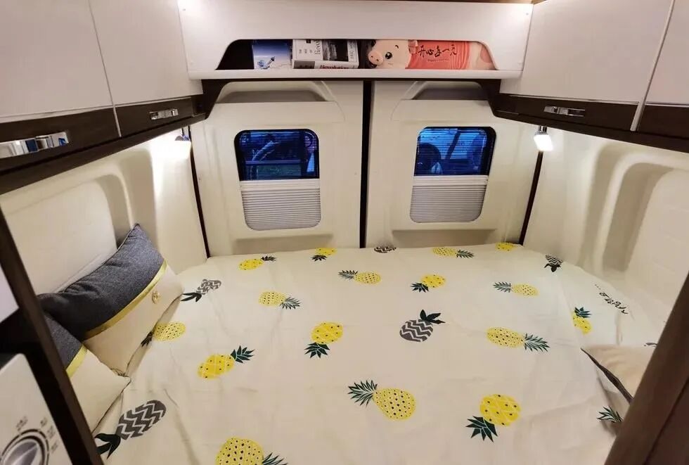 尾部横置双人床的尺寸达2050x1350mm,基本可以与C型房车媲美,满足多人舒适睡眠的需求;而在不需要睡觉时,双人床可翻折变成贯通式过道;下方、顶部设有多个储物空间,储存空间丰富。