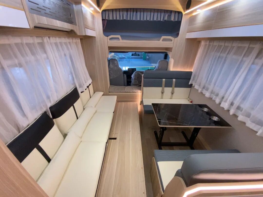 驾驶舱后方生活区驻车升顶后空间非常充足,而在不升顶的情况下,会客区座椅乘坐体验与乘用车基本一致,并带有安全带便于行车时载人;内部配置完善,功能齐全;额头床隐藏式设计,可根据需要进行拓展;加长对坐式卡座可拼床,进一步增加睡卧空间。