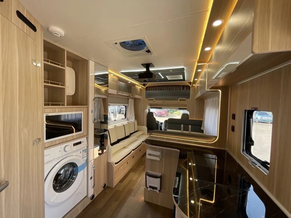 生活区采用后开门、后置厨卫的设计,通透敞亮的空间,极简素雅的家居风格,明黄色氛围灯,精致的做工,让旅居环境更舒适;除了舒适的居住环境外,车内在生活设施方面配置同样齐全,丰富的厨房、卫浴设施满足日常生活需求,大容量洗衣机解放双手,还有K歌娱乐系统、投影仪、家庭影院等娱乐设备,让旅途充满欢乐。