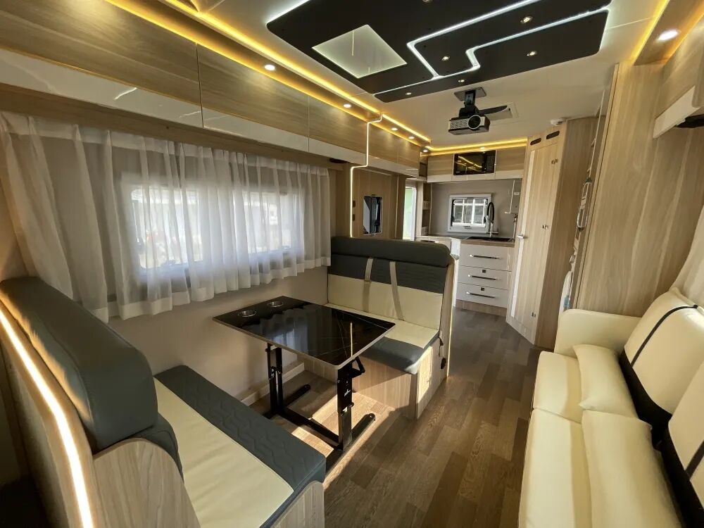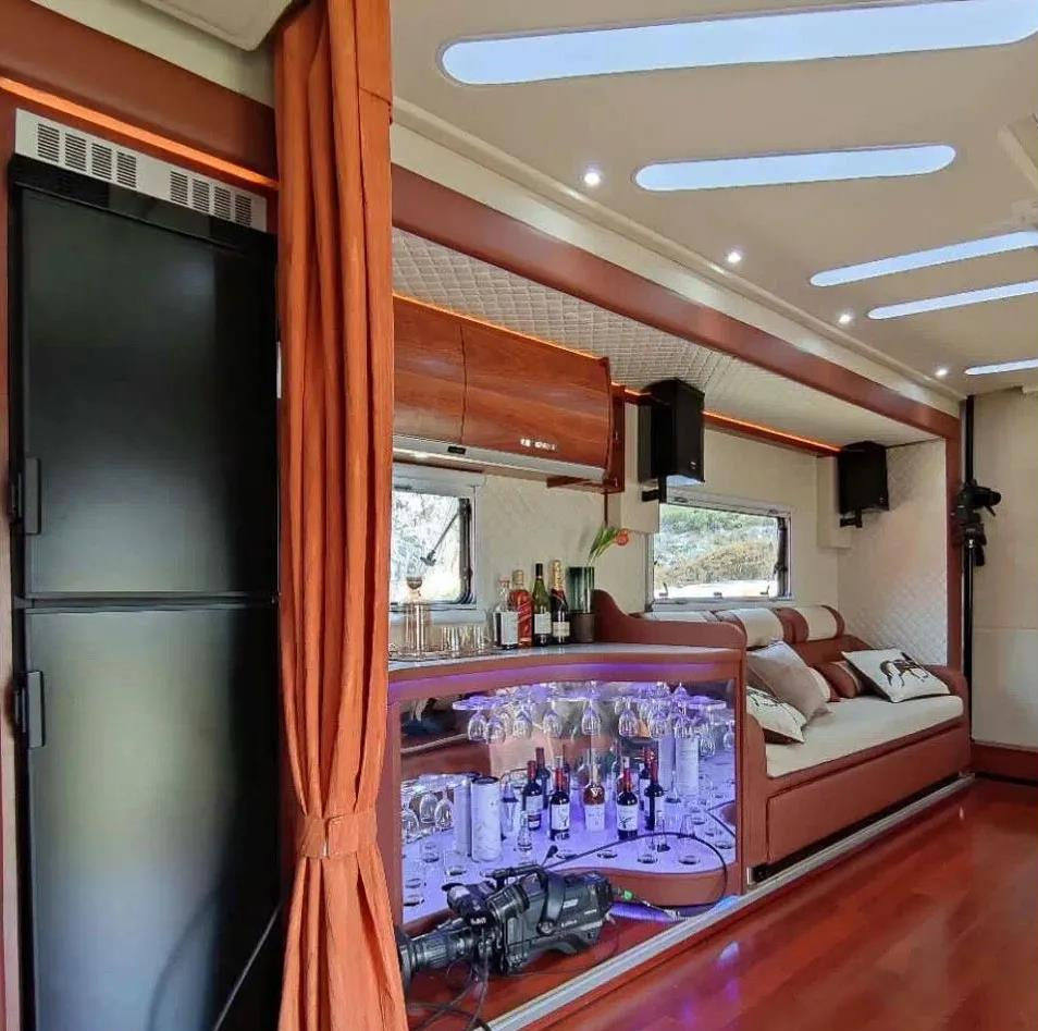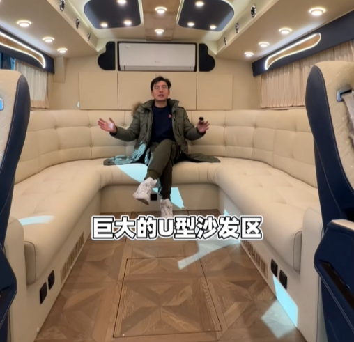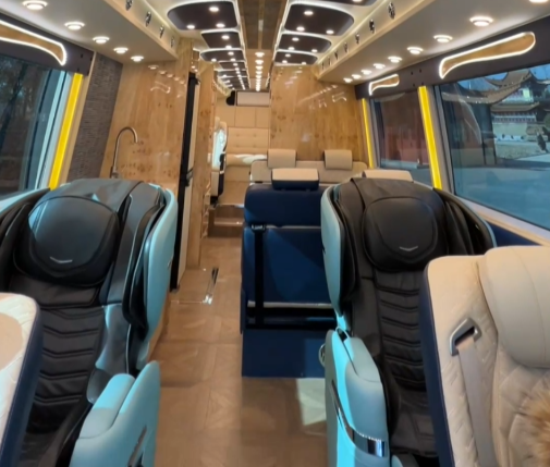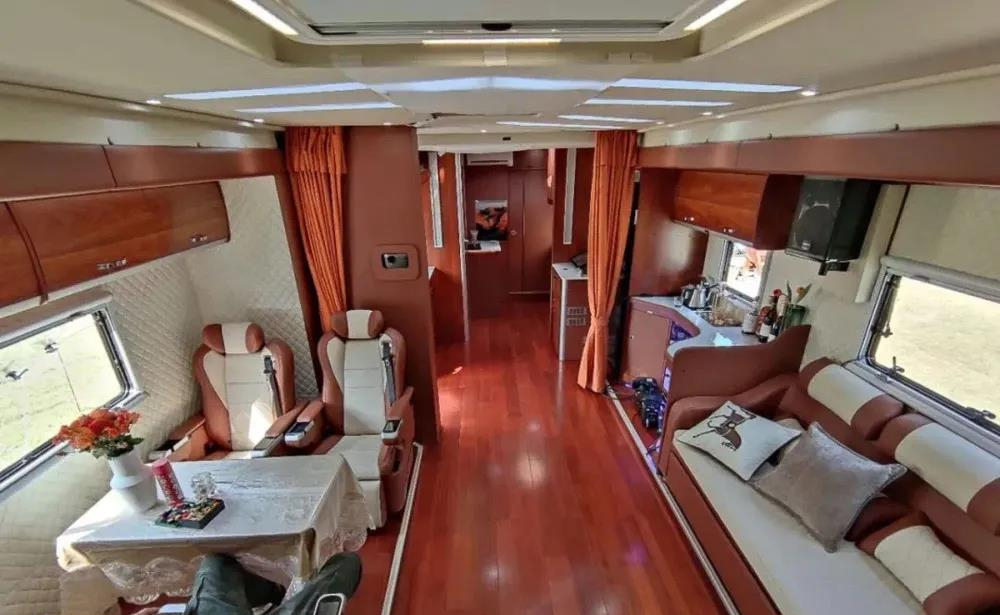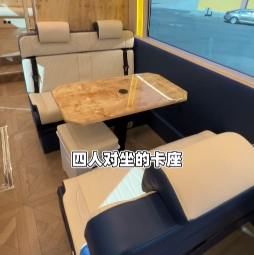 如果用两个字形容车身内部的话,那一定是“豪华”!整车设有四张独立航空座椅,分别位于车身前部与后部;前部航空座椅后方还有两张独立的按摩椅,便于驻车时放松休息,不过需要注意的是,独立按摩座椅由于没有安全带,行车过程中不能坐人;车内中部设有厨房区,烹饪设施一应俱全还有152L的双开门冰箱便于储存食材、冷藏酒水饮料。