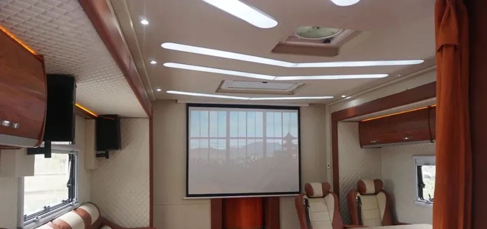 三拓展舱极大改善了生活区的空间表现,整车内部可使用面积接近30㎡;驻车左右两侧拓展机构打开后,能给会客区带来更为宽阔的空间;左侧长排会客座椅可拼床;右侧双人对卡座搭载四个全尺寸航空座椅,座椅带有按摩、加热、通风等功能,乘坐舒适度有保证;日常娱乐方面设有观影幕布、投影仪、多功能立体声音响系统等;顶部顶置空调、换气扇可为生活区带来更清新的空气。