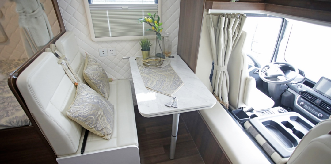 生活区的客厅面积相较同级C型房车来说更为宽阔;左侧长条沙发与右侧对卡座沙发皆可根据需要组合成床,搭配额头睡卧区,整车共有三张床铺,可满足多人睡眠休息的需求。