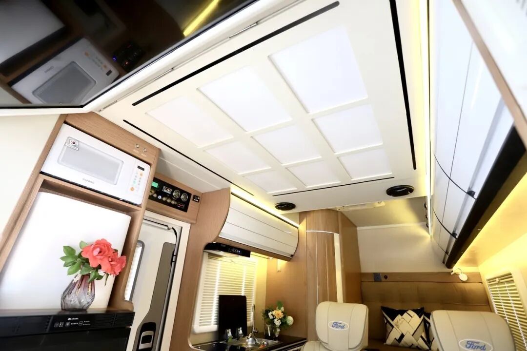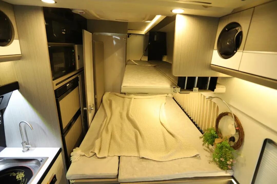 ●水电方面,新车标配200L净水箱、68L灰水箱、800AH锂电、3000W逆变器、600W太阳能板等,满足旅行水电所需;选装配置方面,可选装内置柴油炉、自行车架、洗衣机、后爬梯、前额头观景天窗等设施。