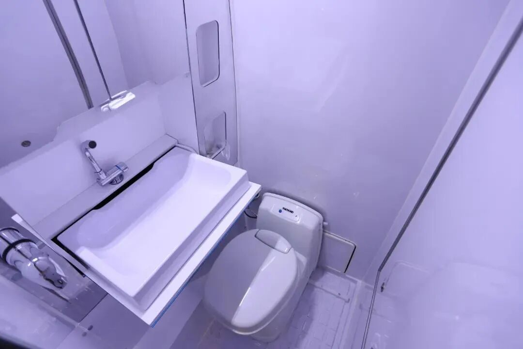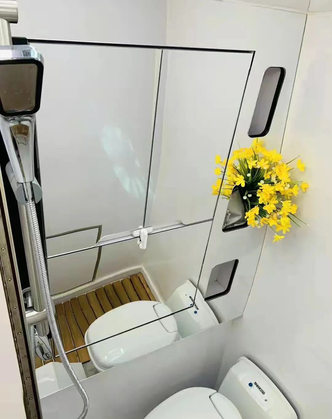 ● 一体式卫浴间底部设有沥水板防止地面积水,内部配置了赛特福德盒式马桶、浴镜、储物格、毛巾架、洗漱池、置物台、双向电动换气扇、独立淋浴花洒等,设施齐全,充分满足旅居生活日常卫生洗漱所需;