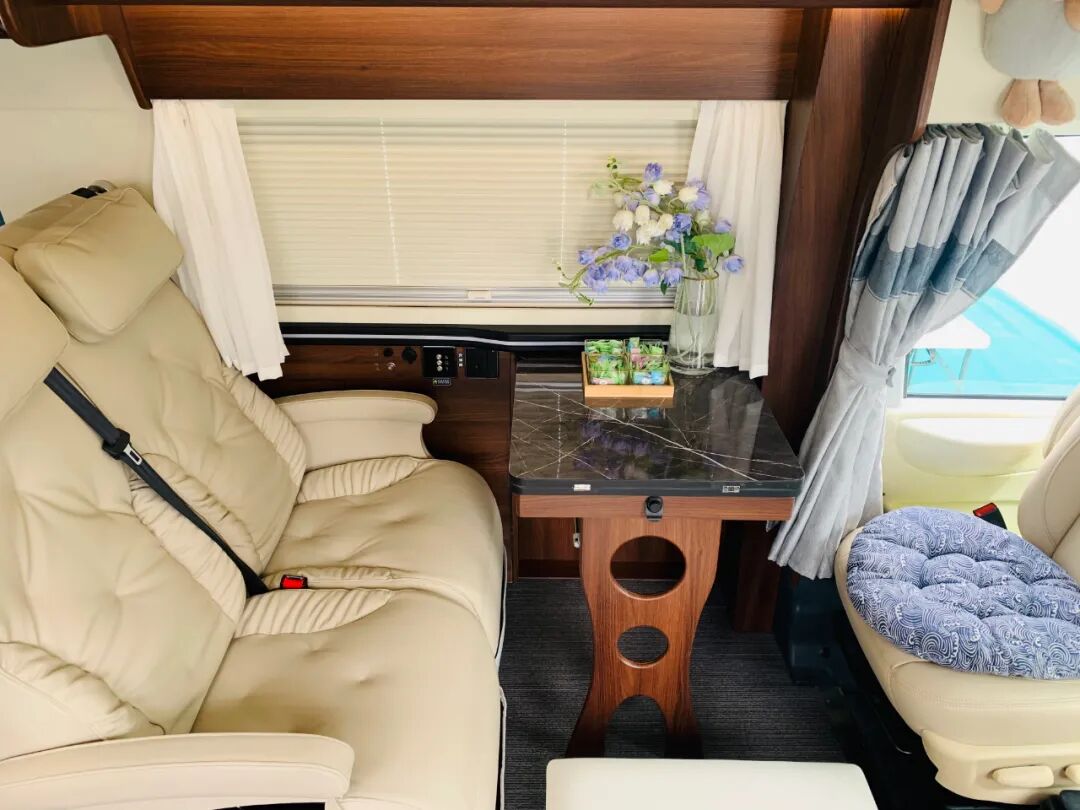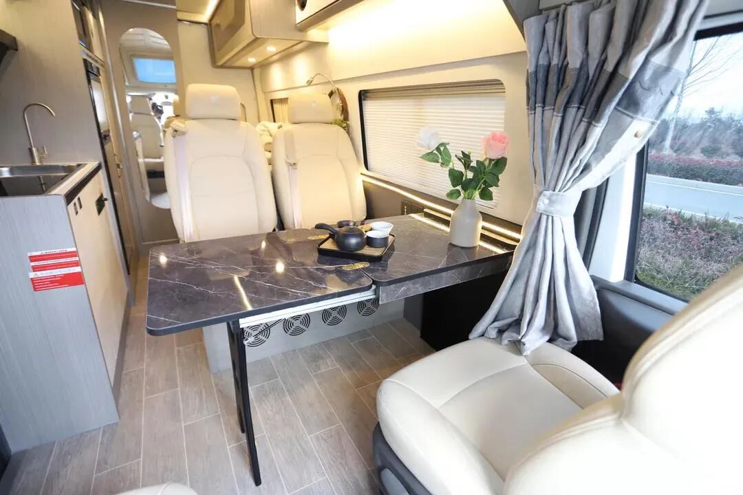 ● 会客区设有双人沙发座椅,中间位置配备电动折叠大餐桌,桌面可随意调节大小,还可与旋转式主副驾驶座组成四人会客厅;